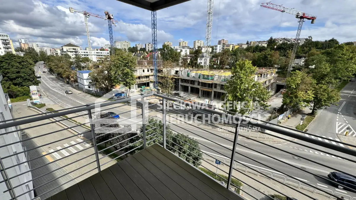 Z salonu i pokoju wyjście na loggię a z nich widok na panoramę miasta i las.