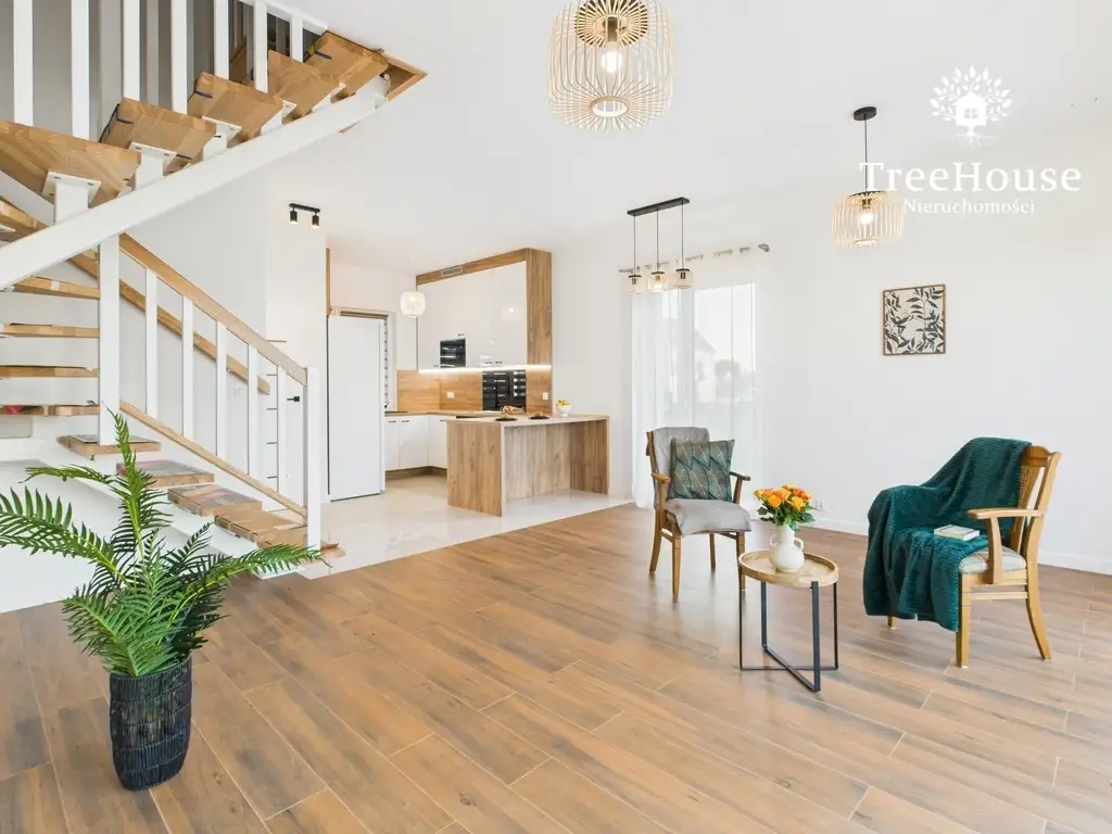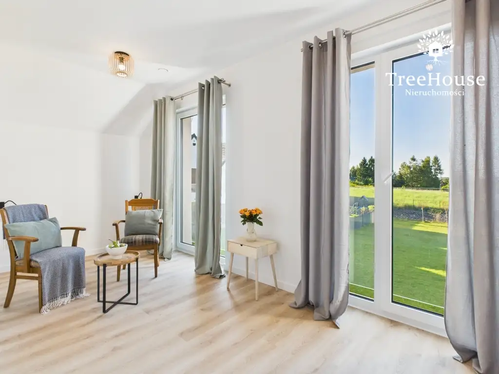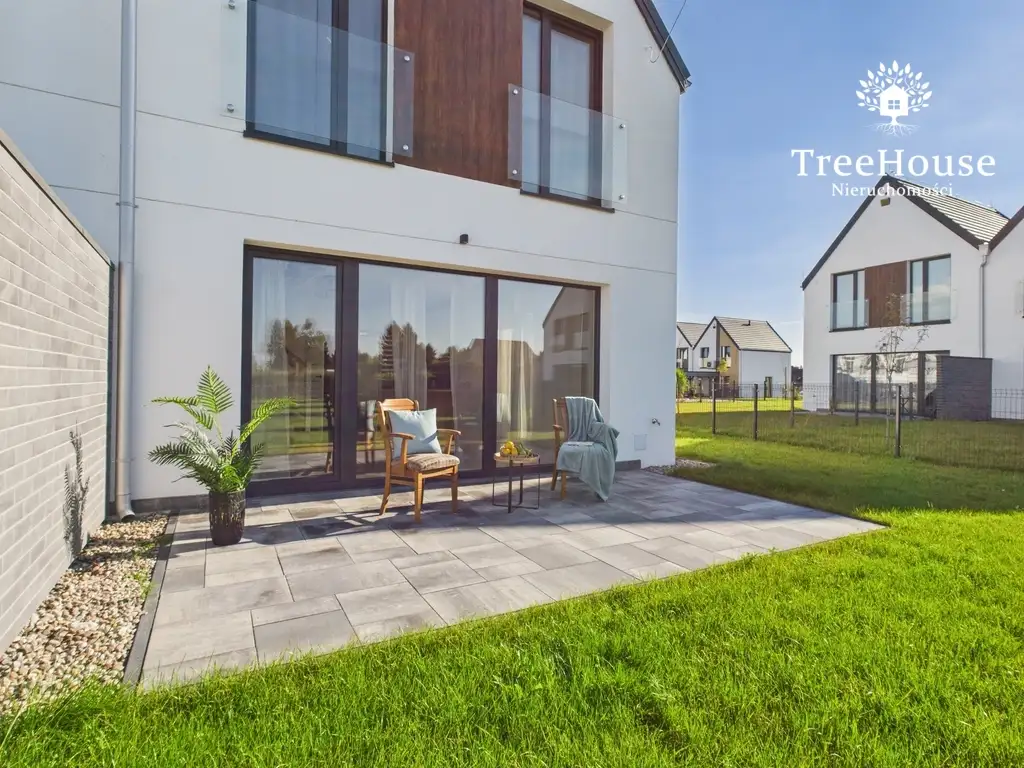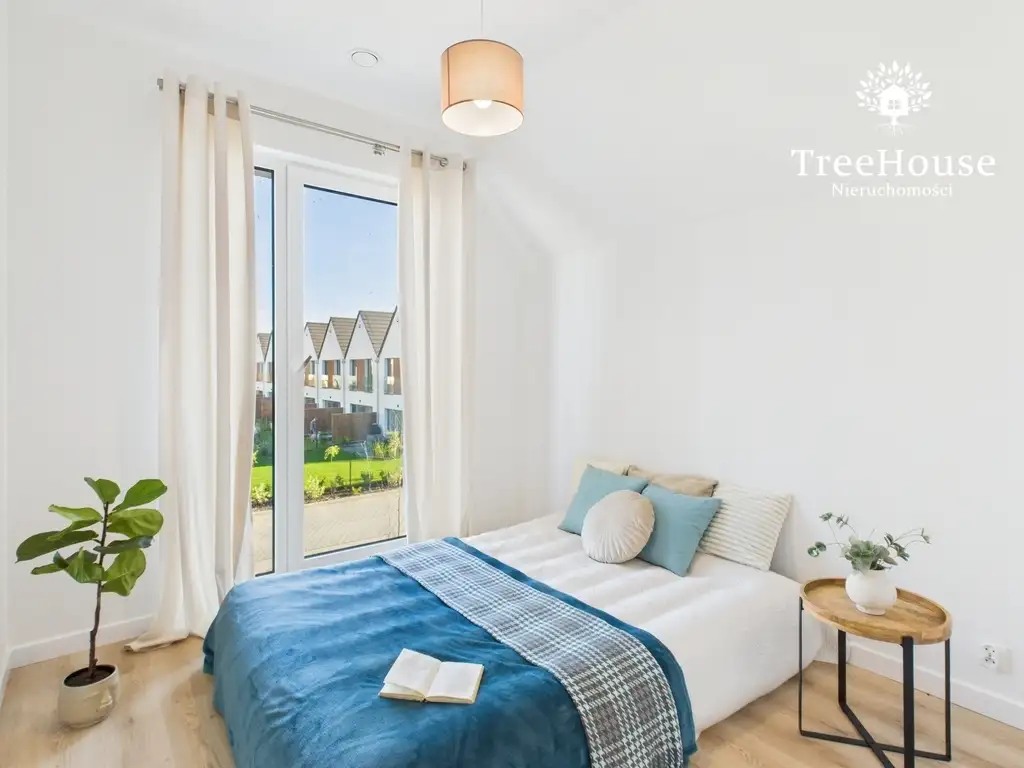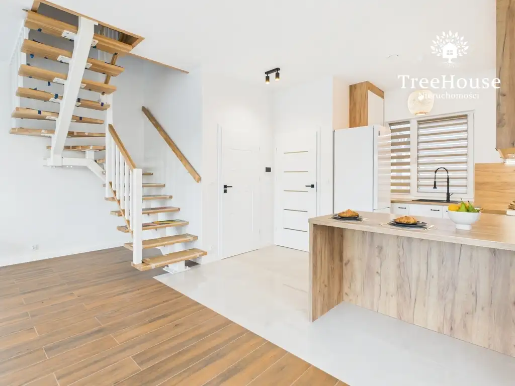 Układ funkcjonalny i wykończenie lokalu: mieszkanie rozkładowe, wejście prowadzi bezpośrednio przez wiatrołap, w którym mieści się zabudowana pojemna szafa wnękowa, z wydzieloną przestrzenią, m.in. na ubrania wierzchnie. Po lewej stronie znajduje się łazienka wyposażona w kabinę prysznicową z odpływem liniowym, wc ze stelażem podtynkowym, szafkę z umywalką, nad którą wisi lustro. Na ścianach oraz podłodze położono płytki. Po prawej stronie usytuowana jest funkcjonalna kuchnia ze stałą zabudową meblową. W skład wyposażenia kuchni wchodzi sprzęt AGD: lodówka, piekarnik, zmywarka, mikrofala oraz okap. Bezpośrednio pod oknem znajduje się zlewozmywak granitowy. Zainstalowana została płyta indukcyjna. Na wprost wejścia do domu mieści się przestronny salon. Na podłodze w kuchni położono płytki zaś w salonie położono panele. W części salonowej przewidziano miejsce na stół jadalniany oraz kanapę. Duża ilość przeszkleń sprawia, że strefa dzienna jest bardzo dobrze naświetlona. Przez jedno z nich wejdziemy bezpośrednio na taras, do indywidualnego ogrodu, w którym wyłożono trawę z rolki. Bezpośrednio z salonu możemy dostać się również na piętro, na które prowadzą jednobiegowe schody, pokryte drewnem. W strefie nocnej na piętrze znajdują się 3 sypialnie oraz łazienka z wanną, wc oraz szafką z umywalką. Sypialnia została wyposażona w pojemną szafę. Na podłodze w korytarzu i wszystkich pokojach położono panele. Ściany i podłogę w łazience pokrywają płytki. W całym lokalu znajdują się białe drzwi wewnętrzne. Dodatkowym atutem lokalu jest poddasze użytkowe, na które wchodzimy z przedpokoju na piętrze, składanymi schodami drabinowymi.