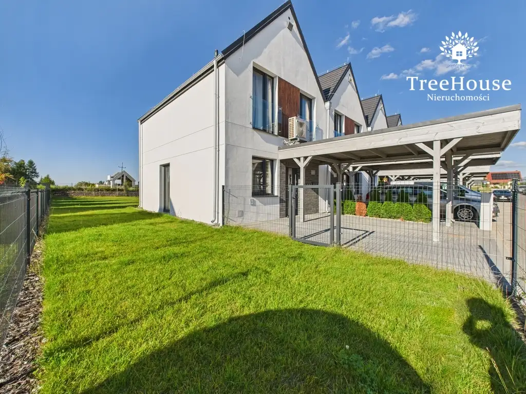 Jest to budynek mieszkalny dwulokalowy, w zabudowie szeregowej, dwukondygnacyjny, niepodpiwniczony, wybudowany w 2024 r. w technologii z betonu komórkowego. Ściany zewnętrzne ocieplone dodatkowo styropianem, a dach wełną mineralną. Dach pokryty blachodachówką w kolorze szarym. Elewacja w kolorze białym, szarym z dodatkami w kolorze drewna. Stolarka okienna: trzyszybowa. Drzwi wejściowe: antywłamaniowe. Dom ogrzewany ekologiczną powietrzną pompą ciepła, we wszystkich pomieszczeniach ogrzewanie podłogowe, dodatkowo: wideodomofon, wentylacja z rekuperacją, taras o powierzchni 14 mkw. Miejsce postojowe przed budynkiem na działce. Budynek przyłączony jest do sieci wodociągowej, kanalizacyjnej, energetycznej. Działka jest kompleksowo zagospodarowana. Podjazd do domu wyłożony kostką brukową wpisującą się w kolorystykę elewacji. Ogrodzenie panelowe ogrodu - w kolorze szarym, nawiązującym do kolorystyki stolarki okiennej i drzwiowej.