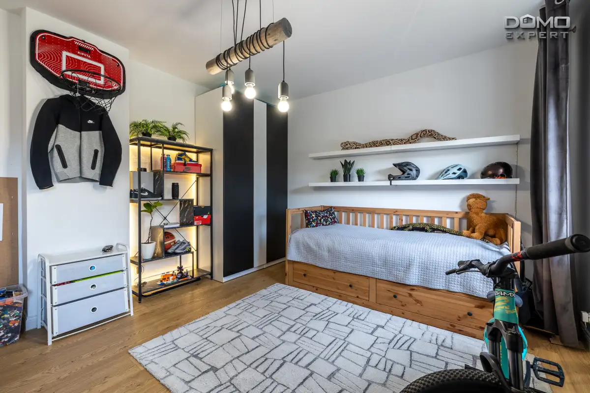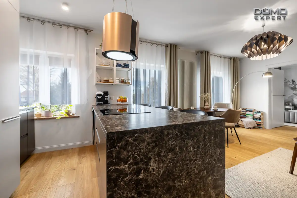 - nowoczesna zabudowa kuchenna z wyspą,- na podłodze płytki i panele,