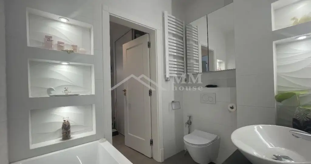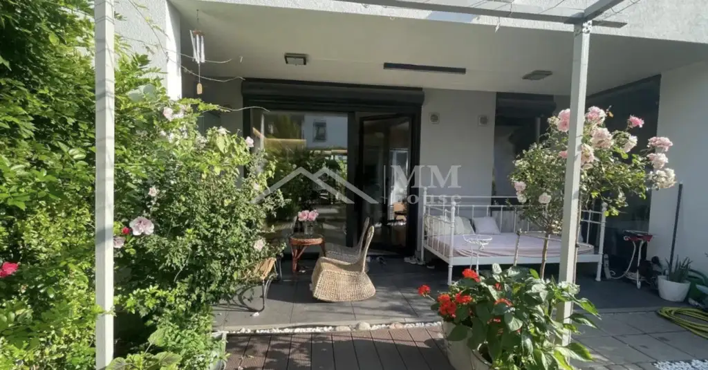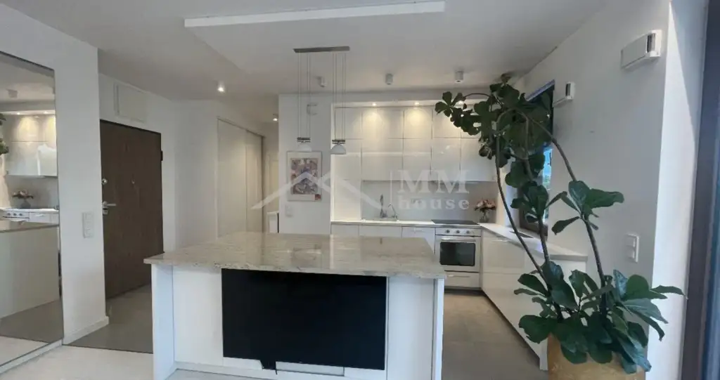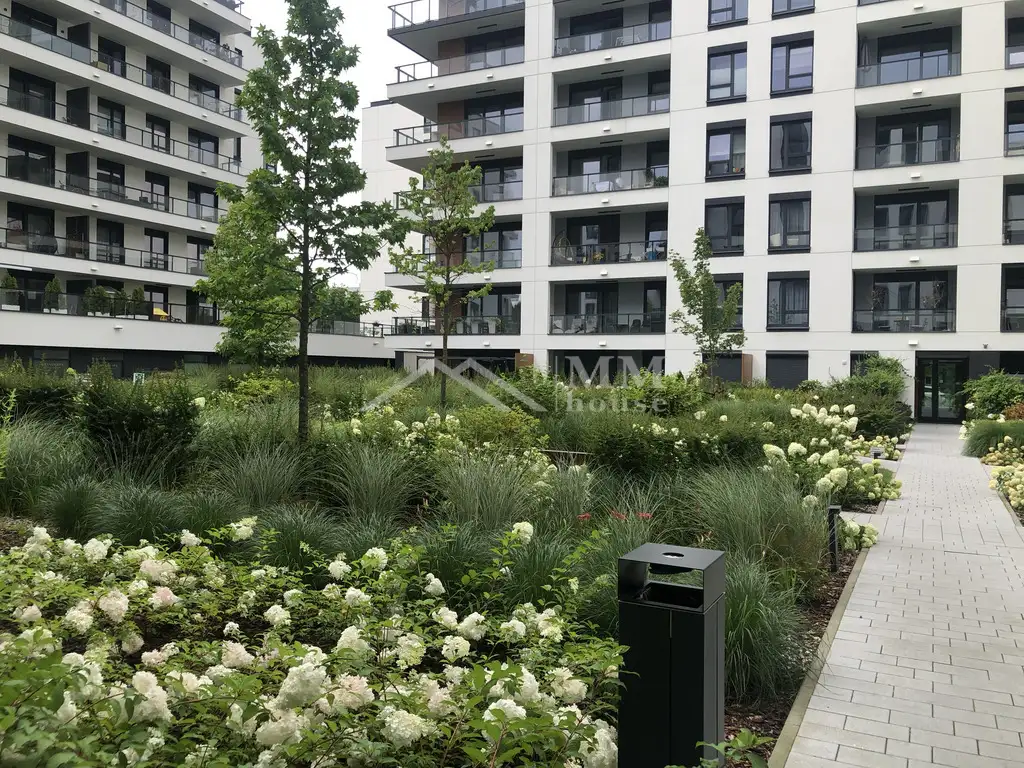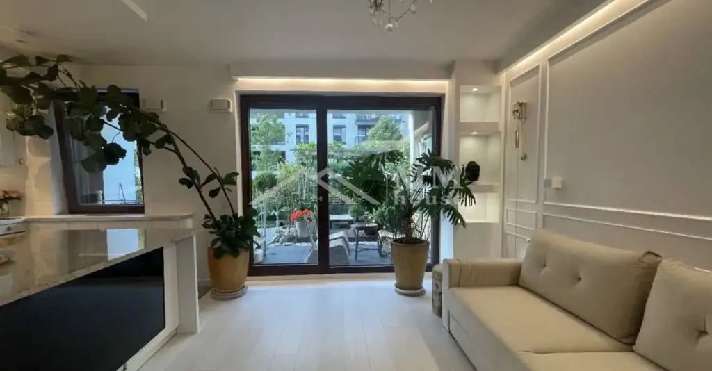 Mieszkanie wykończone jest w nowoczesny, pięknym, jasnym stylu. Doskonale dobrane podłogi sprawiają, że przestrzenie nabierają silnego charakteru przepełnionego jednak spokojem i atmosferą relaksu. Niewątpliwego uroku dodają akcenty roślinnej zieleni, której moc przyciągania zabierze nas z salonu czy sypialni wprost do ogrodu. Roślinność ogrodu to lata pracy, która zaowocowała stworzeniem miejsca idealnego do odcięcia się od miejskiego zgiełku. Ogród wychodzi na wewnętrzną stronę osiedla co sprawia, że hałas ulicy nowego właściciela w zasadzie nie dotyczy. Komfortowa sypialna również zaprowadzi nas do ogrodu, bezpośrednim wyjściem. Przed rozpoczęciem dnia pozwoli nam również w świetnych warunkach przygotować się do jego wyzwań korzystając z zamykanej garderoby. Mieszkanie jest zaprojektowane w sposób umożliwiający przechowywanie dużej ilości rzeczy prywatnych, a sprzęty agd czy telewizor są sprytnie schowane w zabudowie kuchni i kamiennej wyspy.