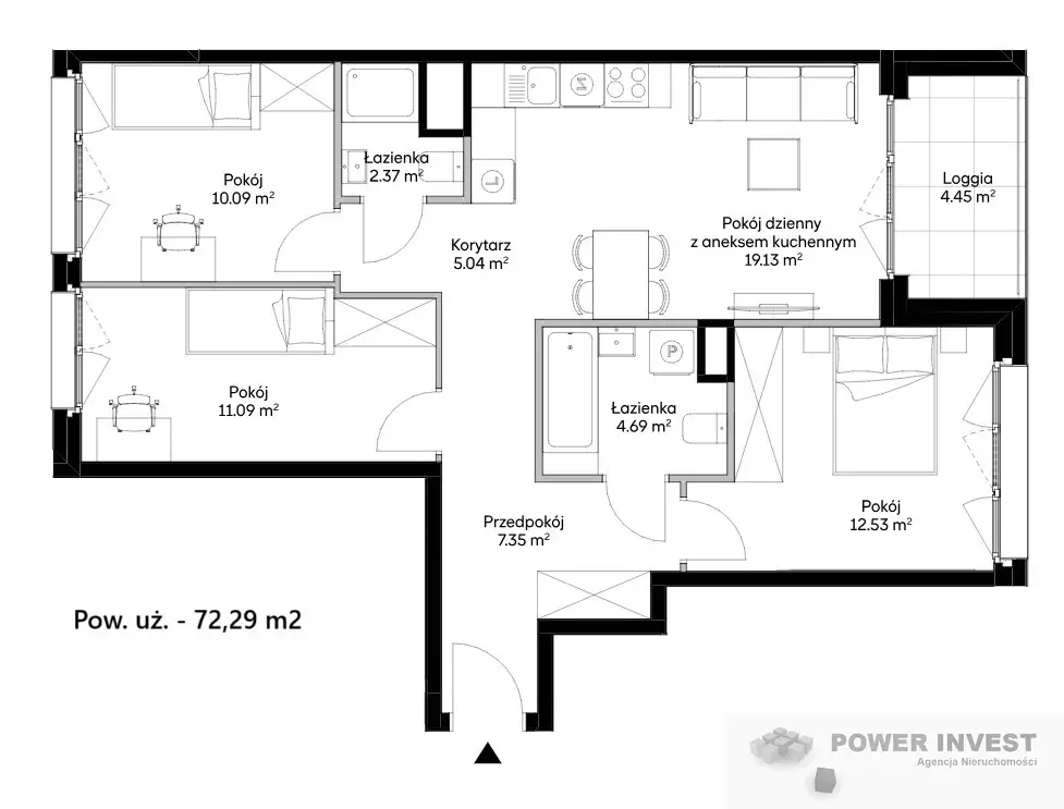 Oferowane mieszkanie znajduje się na 13 piętrze. Lokal ma powierzchnię 72,29 m² powierzchni użytkowej i składa się z:
