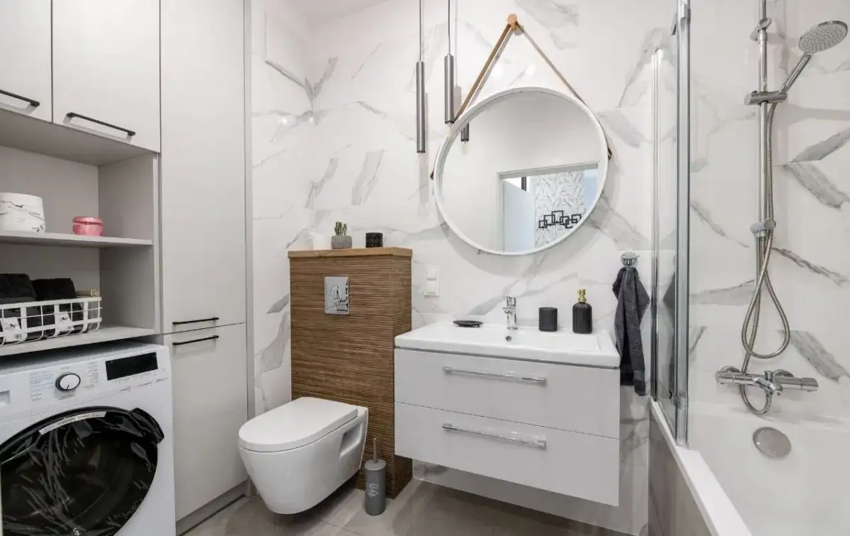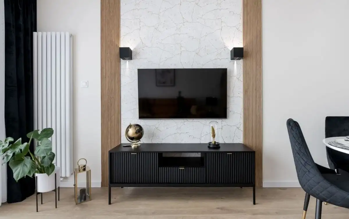 Mieszkanie wykończono przy użyciu wysokiej jakości materiałów. Wszystkie meble znajdujące się w nieruchomości zostały wykonane według indywidualnego zamówienia.
