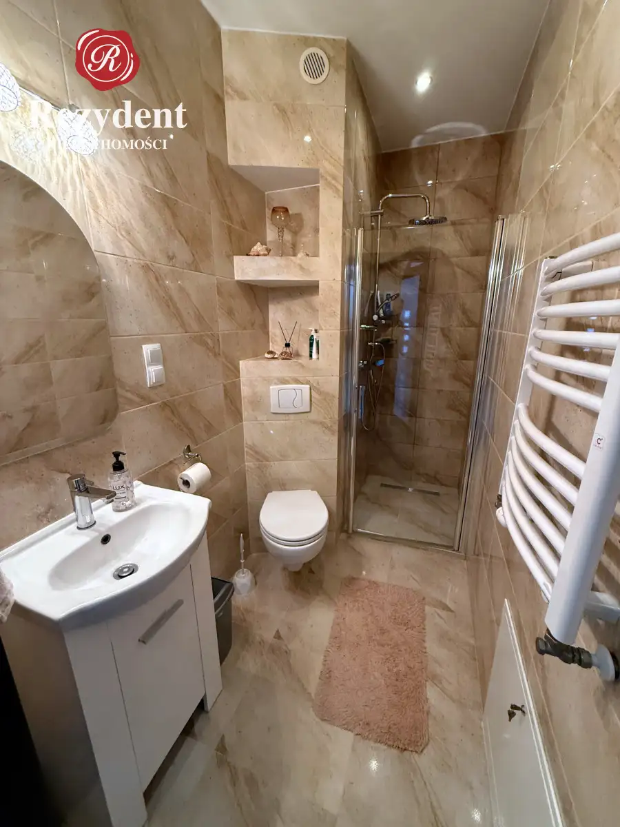 • łazienka wyposażona w kabinę prysznicową, umywalkę i WC
