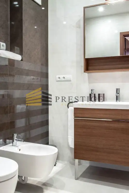 Air conditioning is in all rooms and is individually controlled, exotic marbou wood floor, high-quality tiles, granite, etc. The apartment consists of a living room equipped with luxurious furniture (leather sofa bed, 2 armchairs, table with chairs, a set of wardrobes) and a 3 D TV with WIFI and Internet with an open kitchen, fully equipped with high-class household appliances (fridge-freezer, dishwasher, induction hob, oven with microwave, set of kitchen utensils), bedroom (large bed, bedside tables, lamps, three-door wardrobe, TV) connected to a bathroom with a bathtub, equipped washer-dryer, bidet batteries, second bedroom (large bed, bedside tables, large wardrobe, lamps, desk, armchair), a second bathroom additionally equipped with a bidet and a hall with a wardrobe (vacuum cleaner, iron, ironing board, etc.)