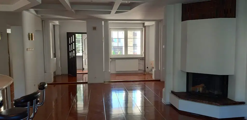 -salon z kominkiem i wyjściem na duży, ogrodowy taras,