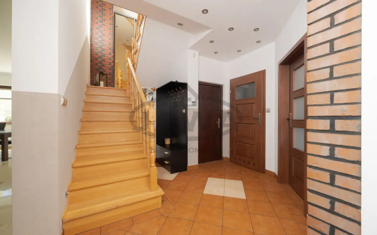 W bryle budynku znajduje się pomieszczenie (z własnym wejściem od strony ogrodu) który w tej chwili spełnia funkcję pralni i kotłowni bowiem w nim znajdziemy pralkę jak i piec na ekogroszek.