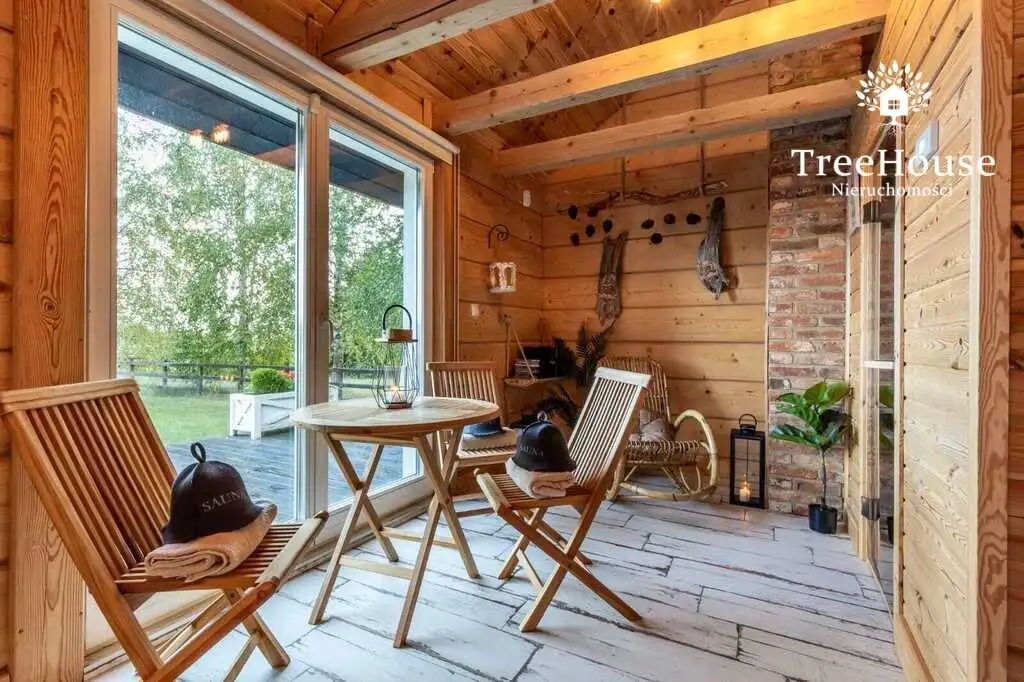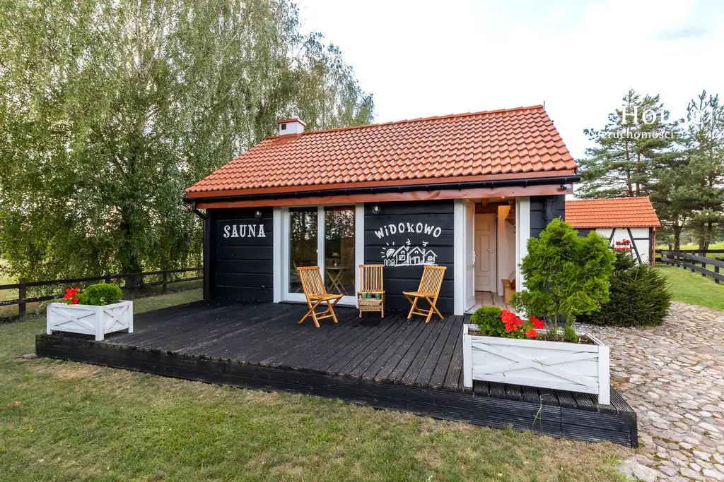 Na terenie ośrodka znajduje się również sauna. Sauna to budynek z bala o powierzchni 35 m², na pełnym fundamencie, z ogrzewaniem podłogowym, toaletą, prysznicem i wiaderkiem bosmańskim. Duże tarasowe okno posiada potrójne szyby, zaś taras ma ponad 20 m². Budynek sauny wyposażony jest również w komin, istnieje więc możliwość podłączenia kominka. Budynek sauny po odpowiednim przystosowaniu może pełnić funkcję dodatkowego, całorocznego domku.