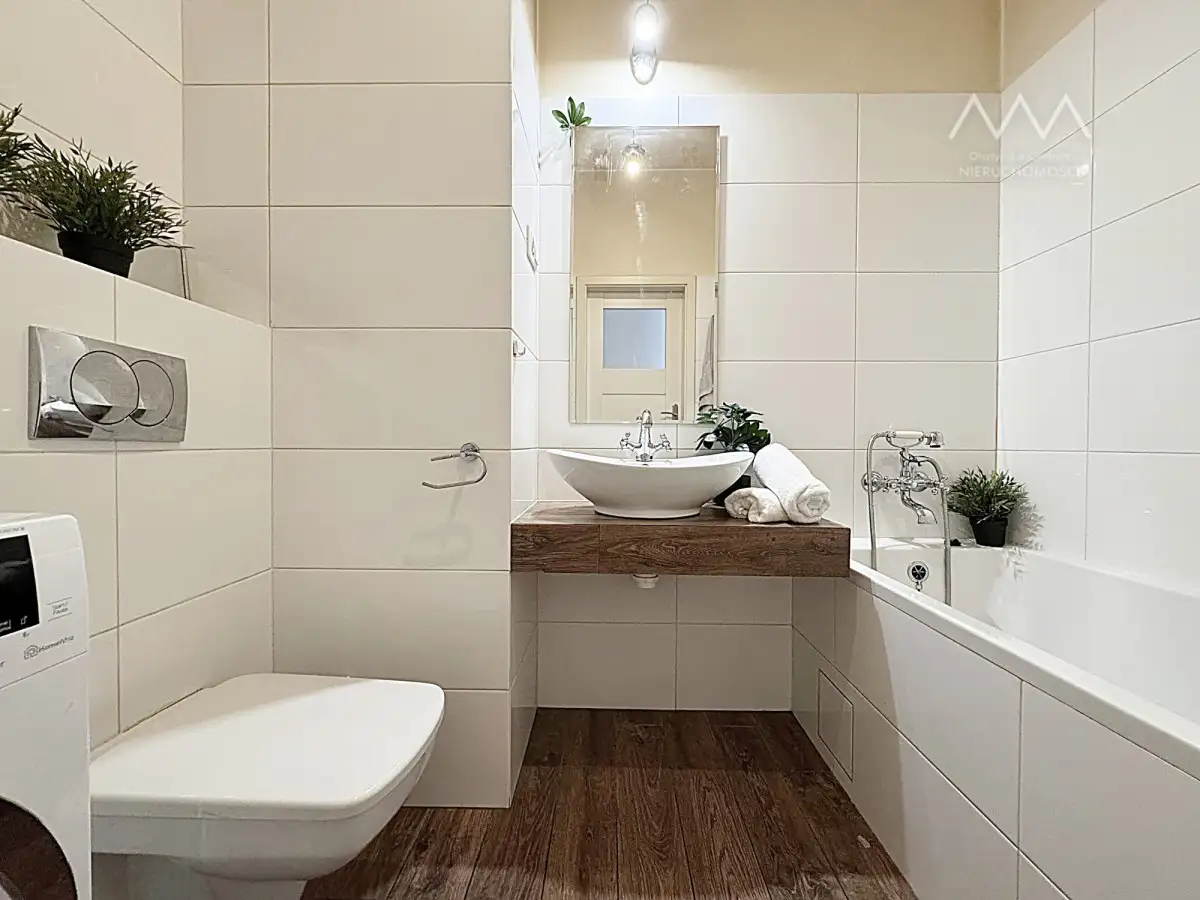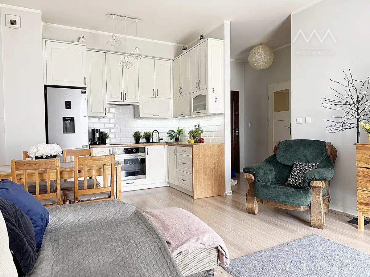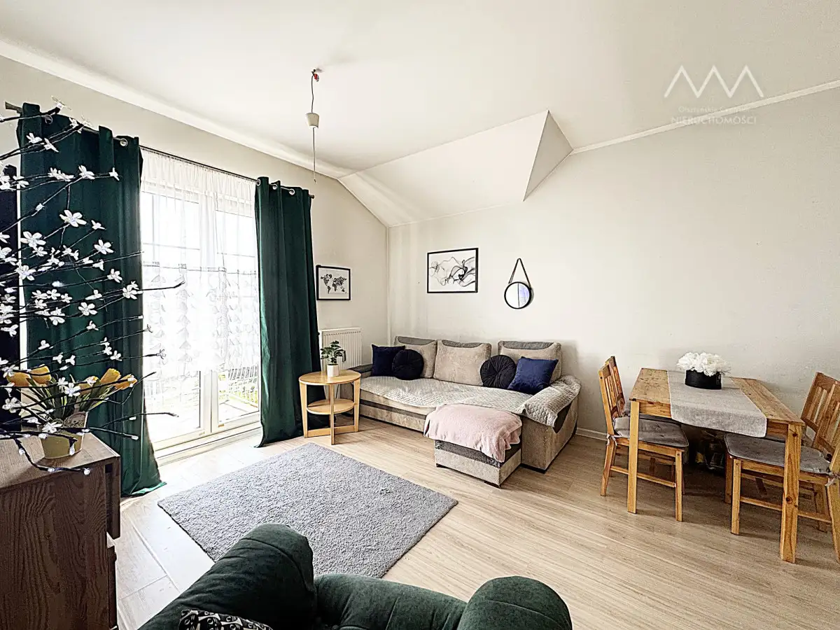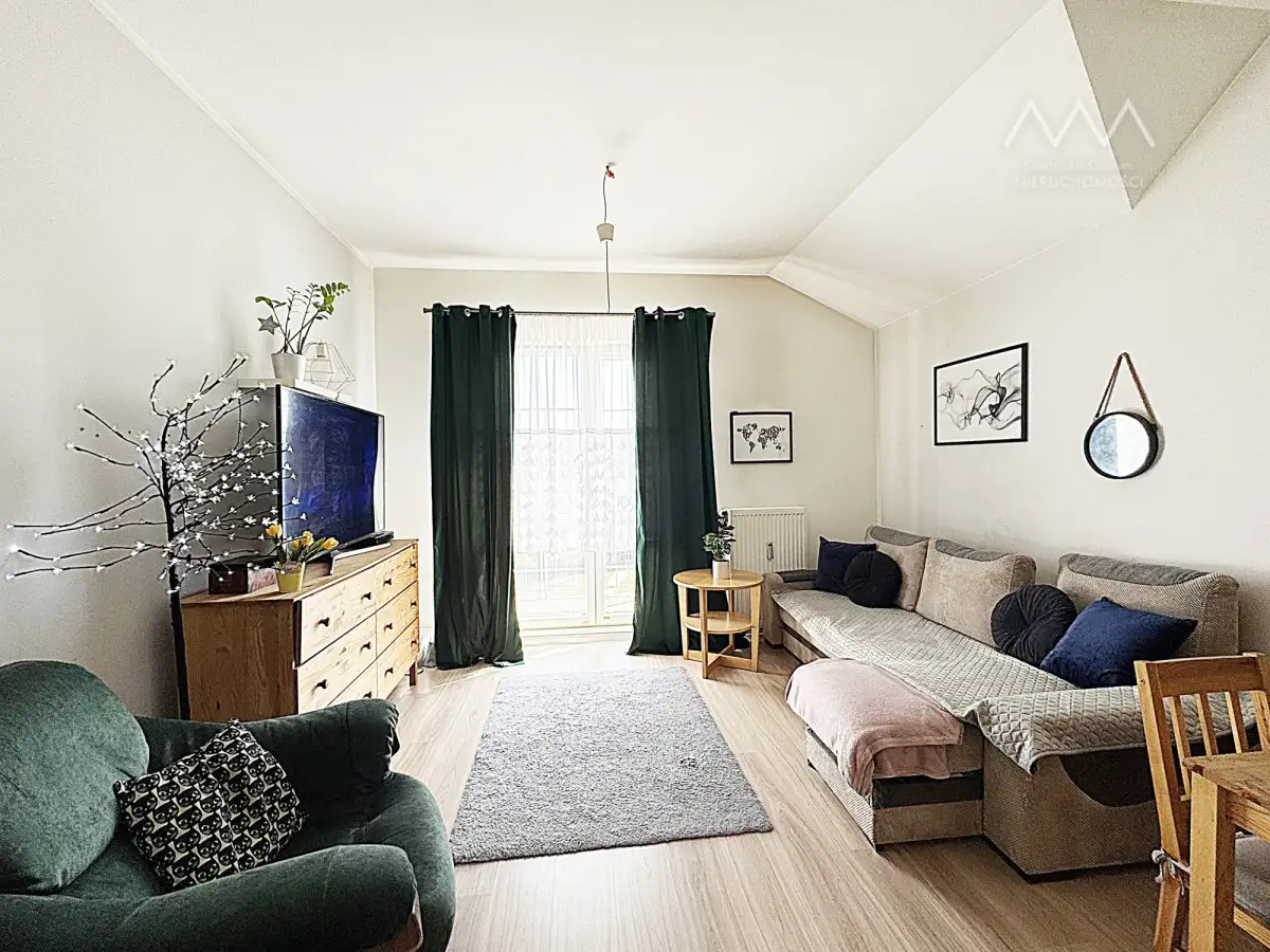 Mieszkanie znajduje się w zadbanym budynku, a jego układ funkcjonalnie rozdziela przestrzeń na część dzienną i nocną, co zapewnia komfort użytkowania.