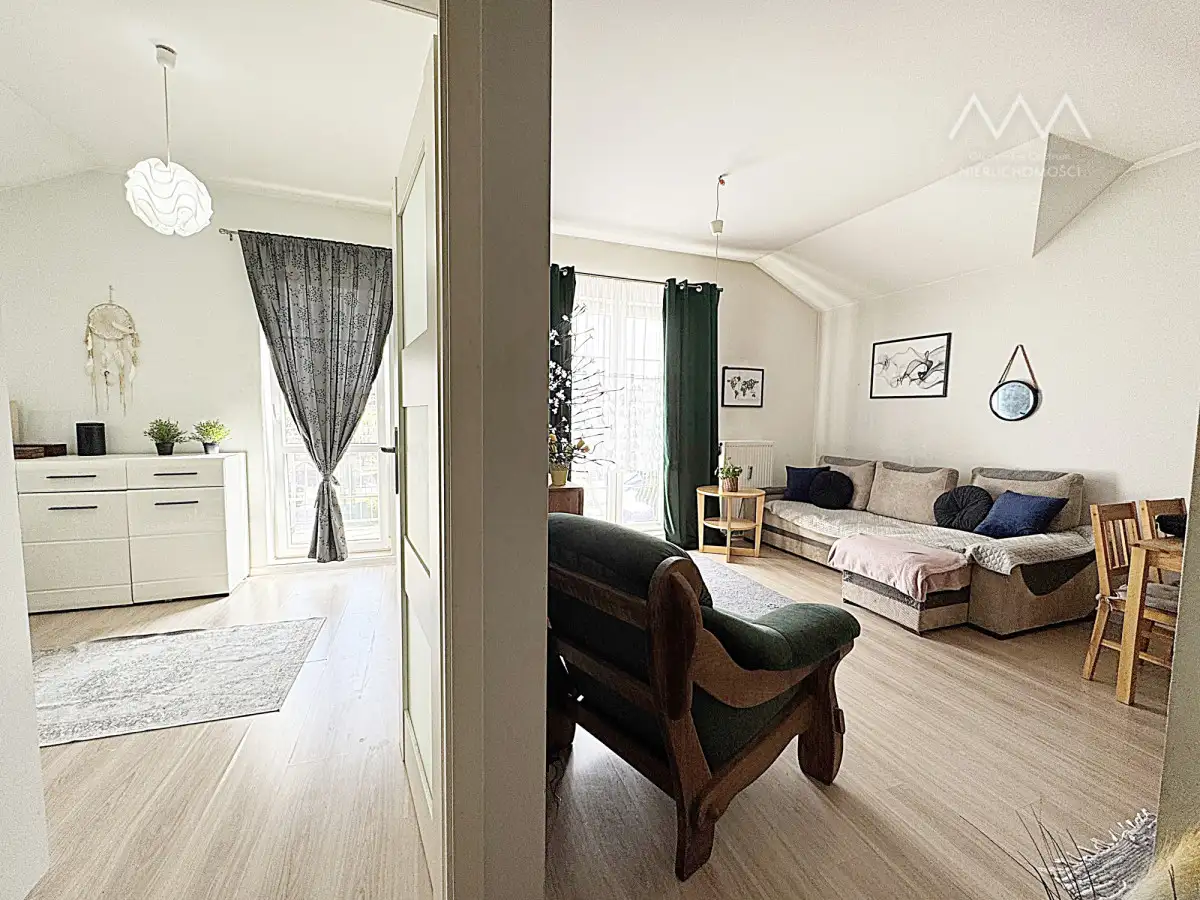 Zarówno z salonu, jak i z drugiego pokoju można wyjść na balkon - to świetne rozwiązanie, które zwiększa komfort codziennego życia i daje więcej możliwości relaksu na świeżym powietrzu.