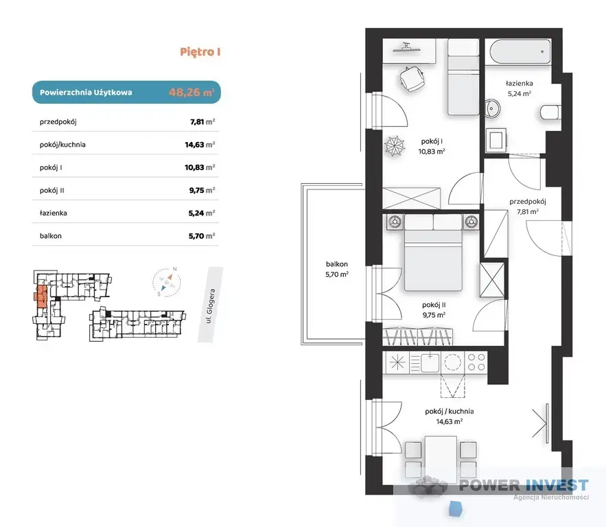 Mieszkanie znajduje się na 1 piętrze. Lokal ma powierzchnię 48,26 m² i składa się z: