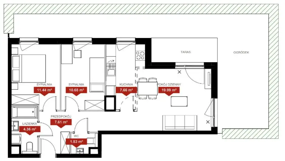 - kuchnia (możliwość wydzielenia) - 7,66 m²