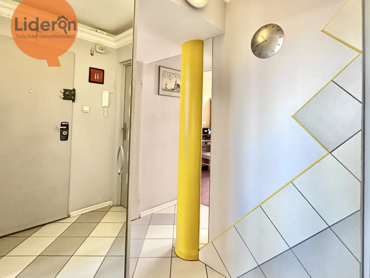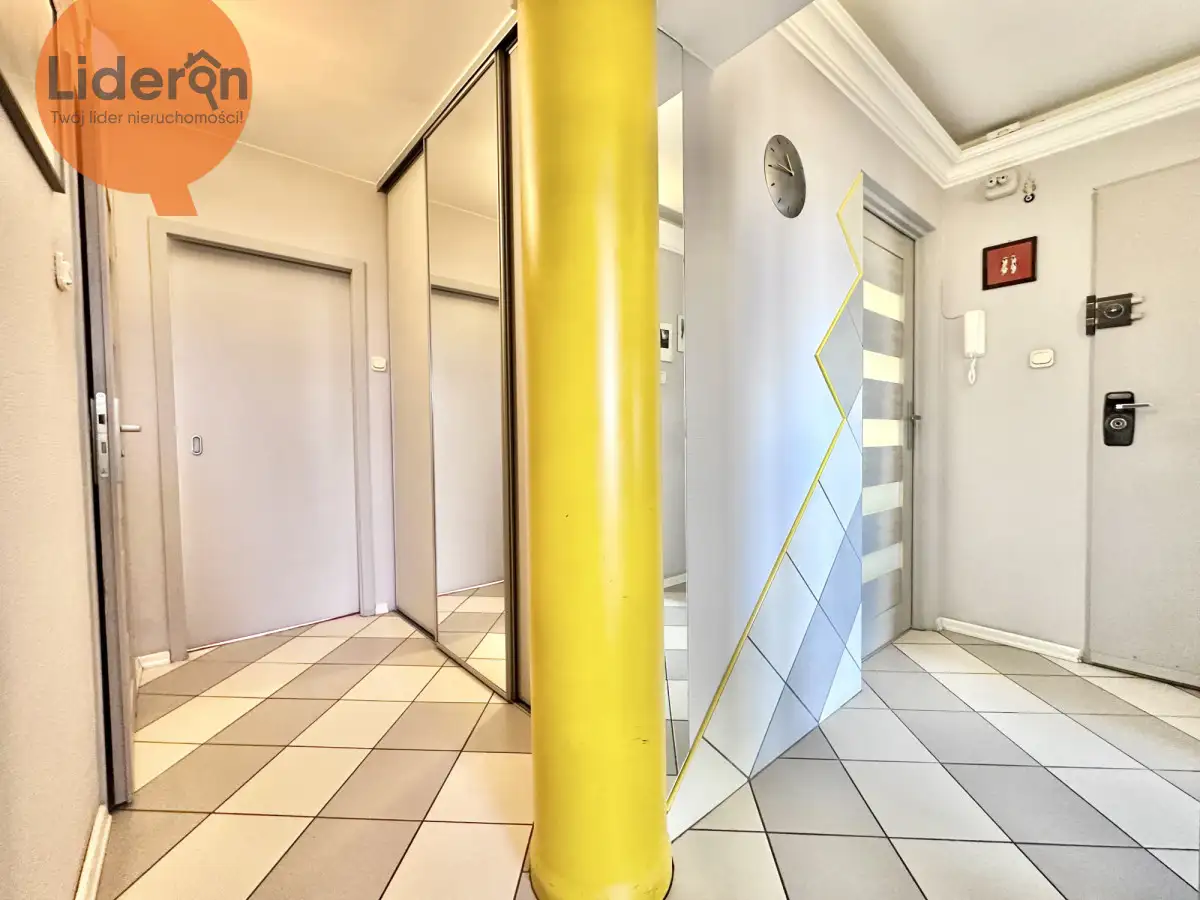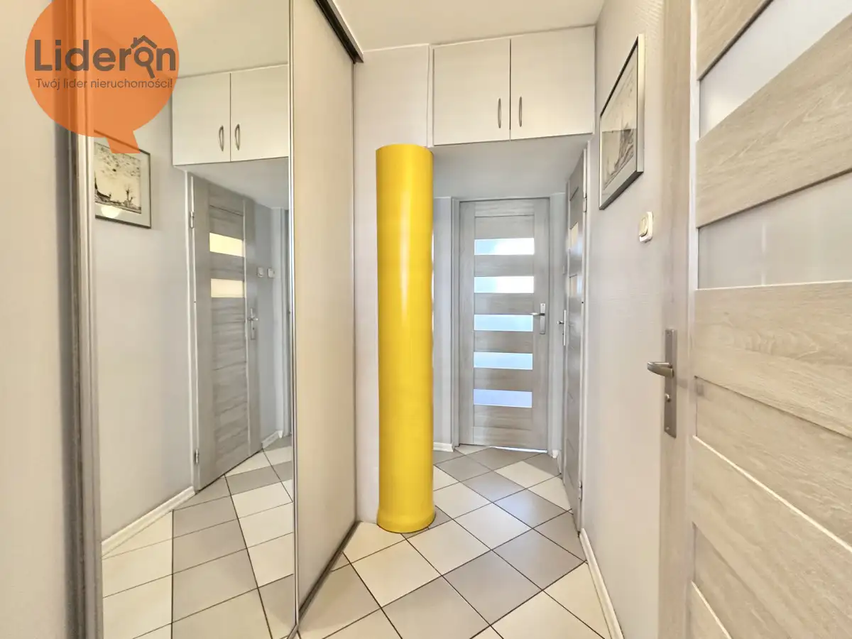 przedpokój jest w kształcie litery L, znajdują się w nim również szafa w zabudowie i szafka na ubrania z lustrami, co daje wrażenie przestrzeni.