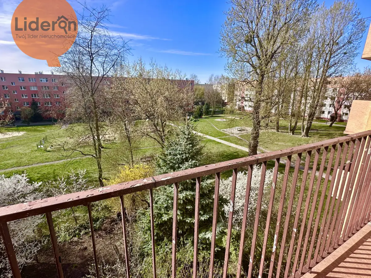 balkon - idealne miejsce na poranną kawę z widokiem na zielony skwer i przestrzeń przed blokiem.