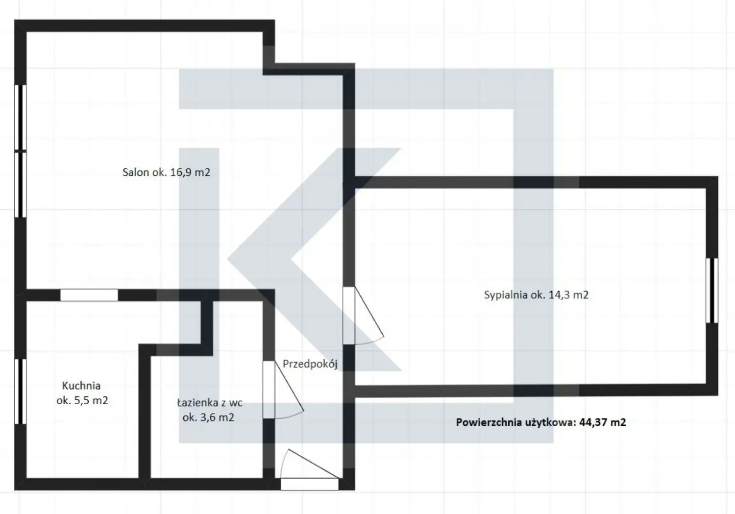 Powierzchnie: mieszkanie mierzy 44,37 m² powierzchni użytkowej i znajduje się na 1 piętrze bloku (p. 1/3); na powierzchnię składają się: 2 pokoje, kuchnia, łazienka z WC, przedpokój. Dodatkową powierzchnię stanowi piwnica (3,3 m²). Mieszkanie dwustronne.