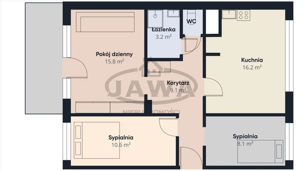 dwie ustawne sypialnie o zbliżonych powierzchniach,