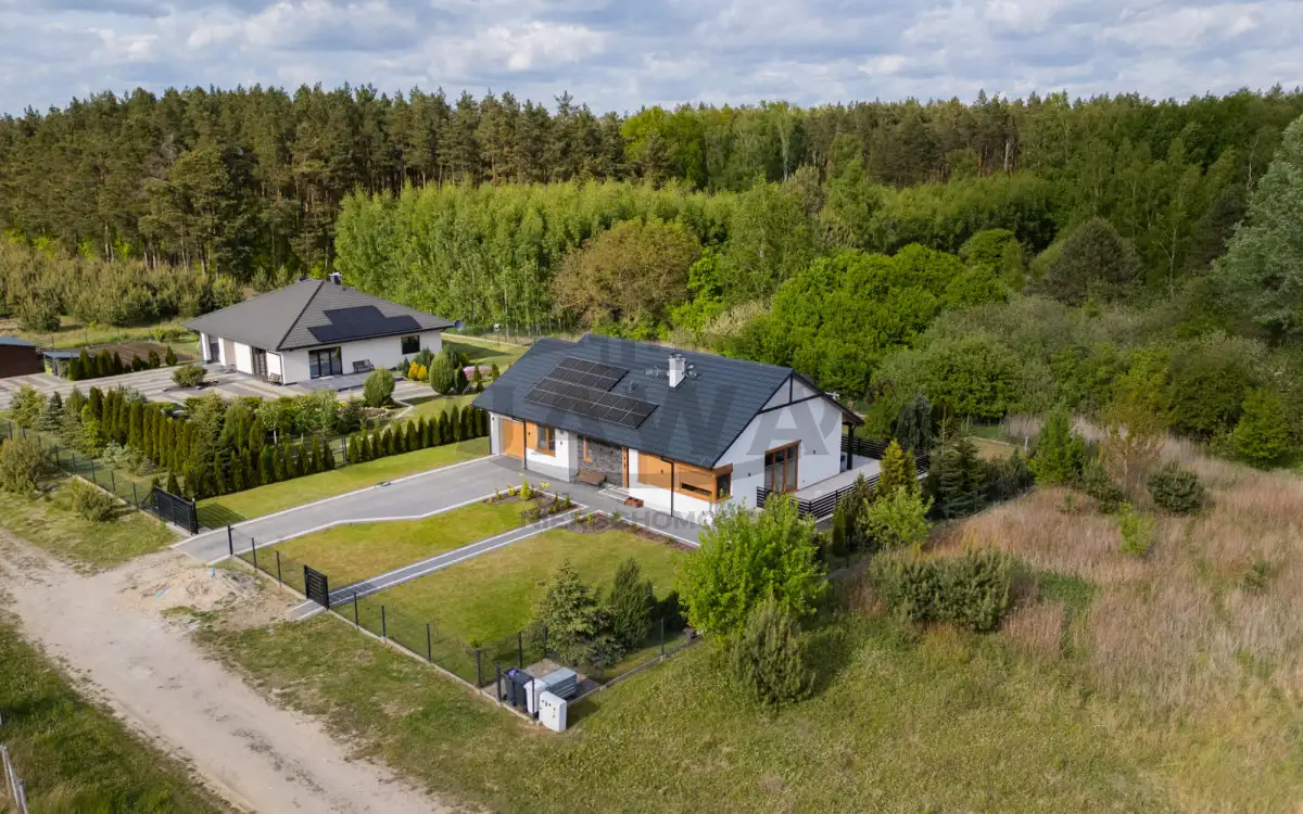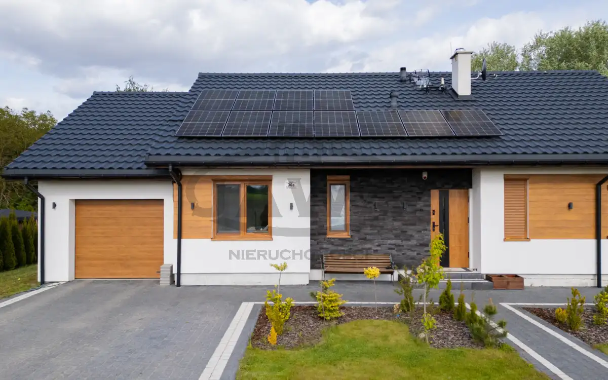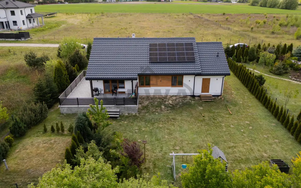 Dom zbudowany w systemie szkieletowym, bardzo ciepły zimą, chłodny latem, zaizolowany wełną mineralną oraz styropianem, wyposażony jest między innymi w: