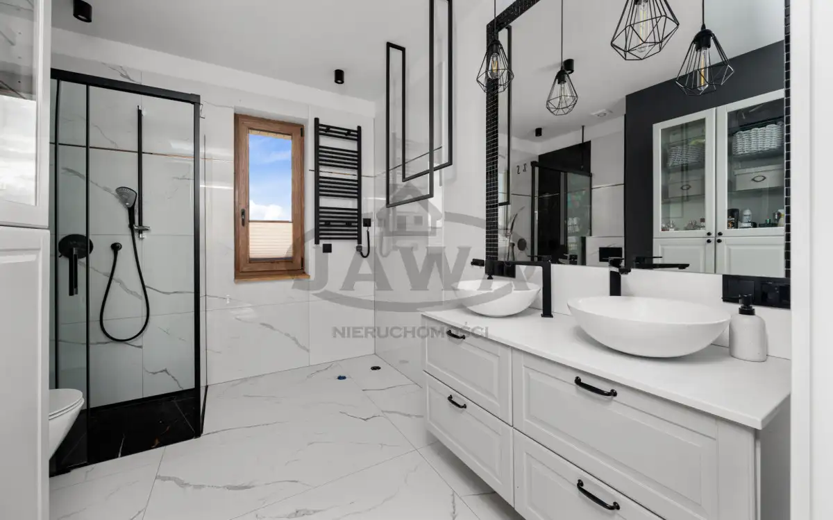 - łazienka z prysznicem i dwiema umywalkami
