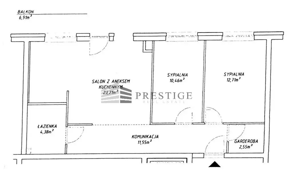 Rozkład pomieszczeń: Pokój dzienny z aneksem kuchennym: 23,21 m², z wyjściem na balkon (6,91 m²)