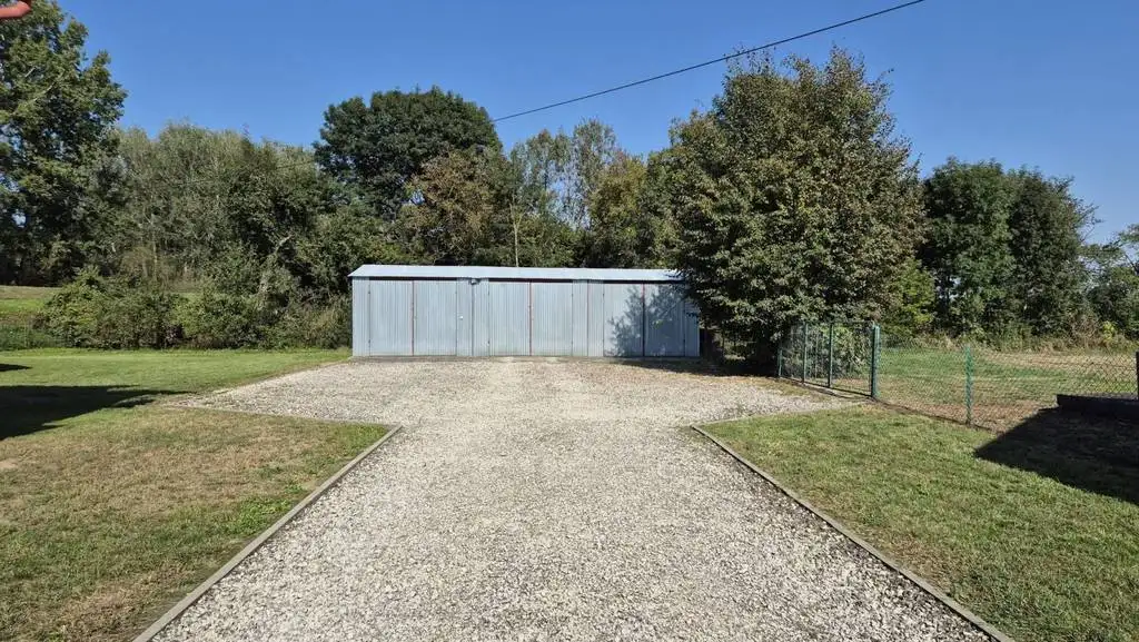 6. Budynek gospodarczy (80m²- stan dobry) – wiata stalowa, konstrukcja nośna z kształtowników stalowych, obudowa dachu i ścian z blachy trapezowej, posadzka betonowa