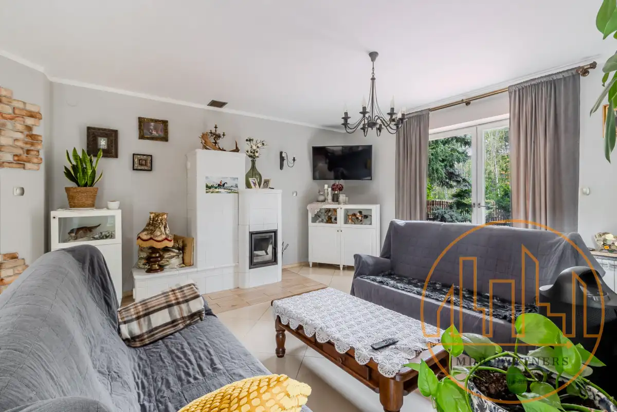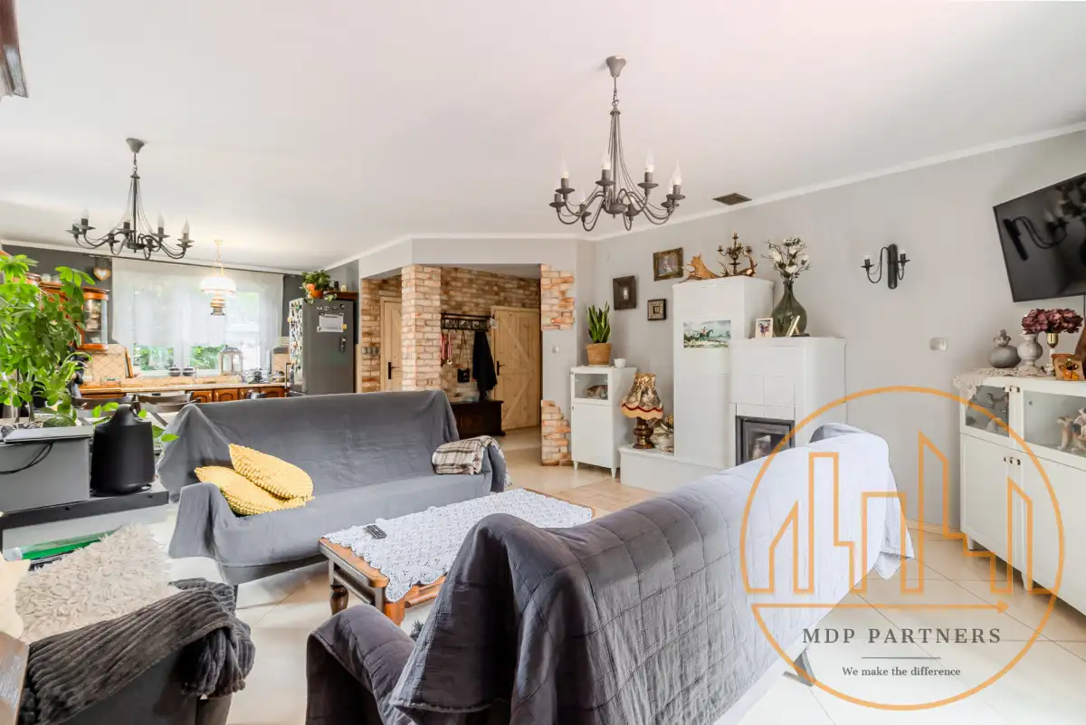 - przestronny salon z kominkiem połączony z kuchnią,