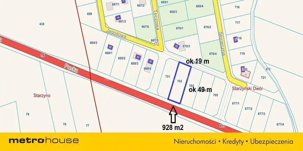 Oferuję Państwu parcelę o powierzchni 928 m², w kształcie prostokąta o wymiarach ok 19m x 49m, dobrze nasłonecznioną w sąsiedztwie NOWYCH domów jednorodzinnych.
