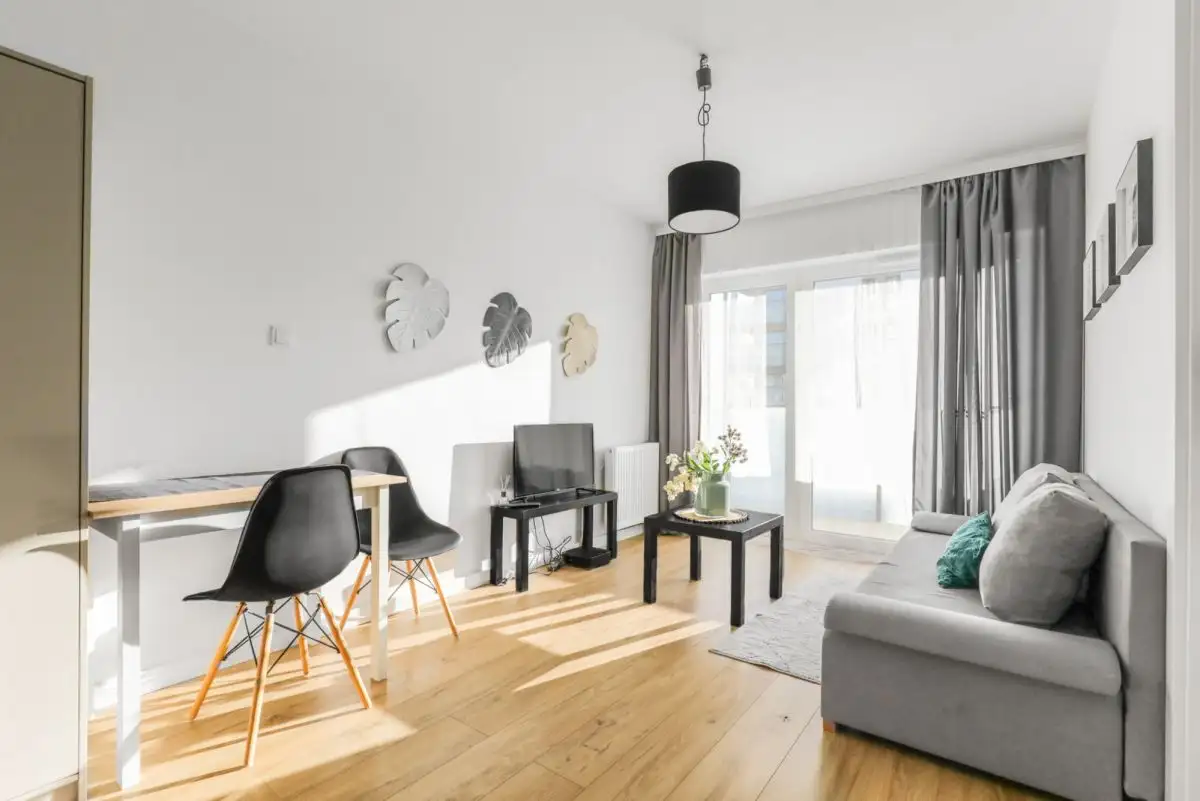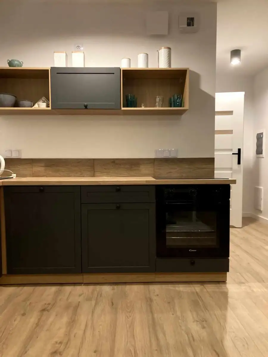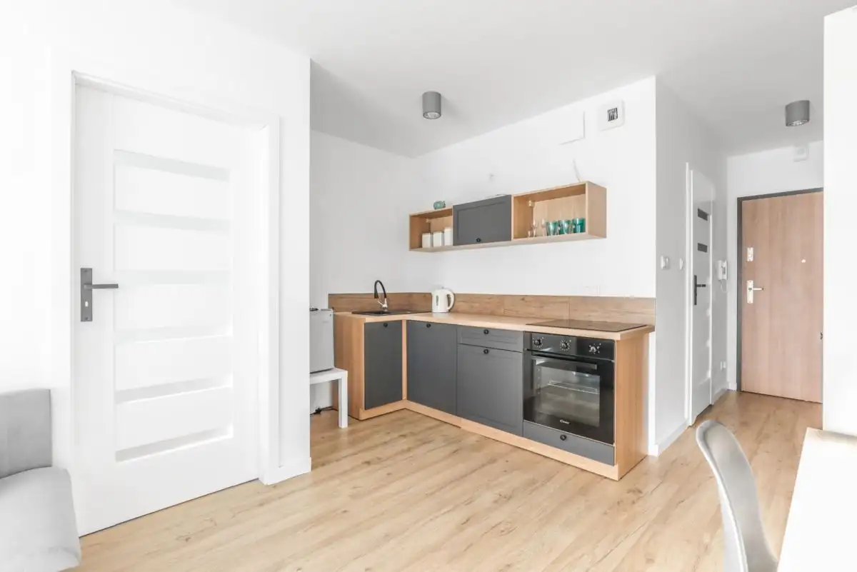 - Pokój dzienny z aneksem kuchennym ( zmywarka, zlew, płyta indukcyjna, piekarnik, meble ) i balkonem od południa.