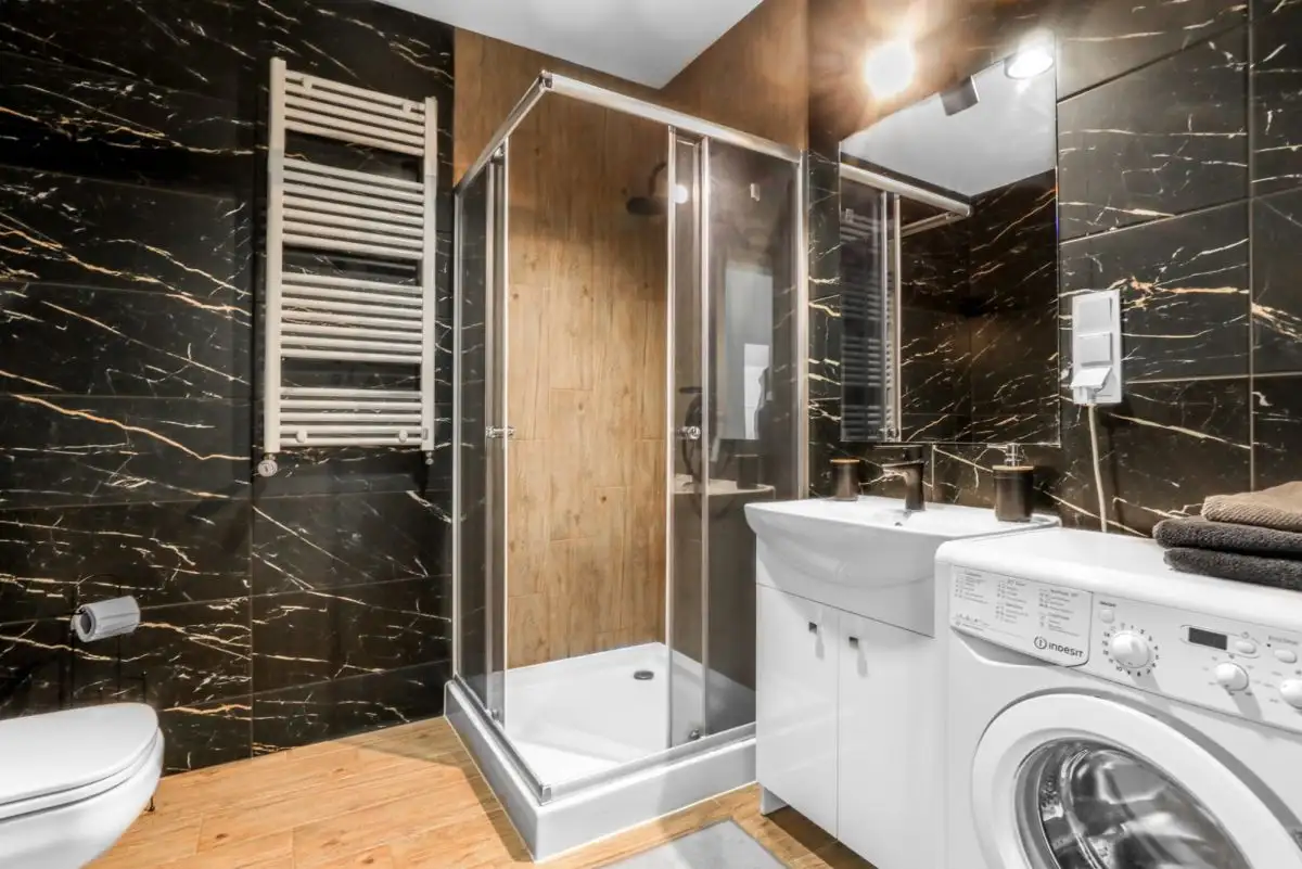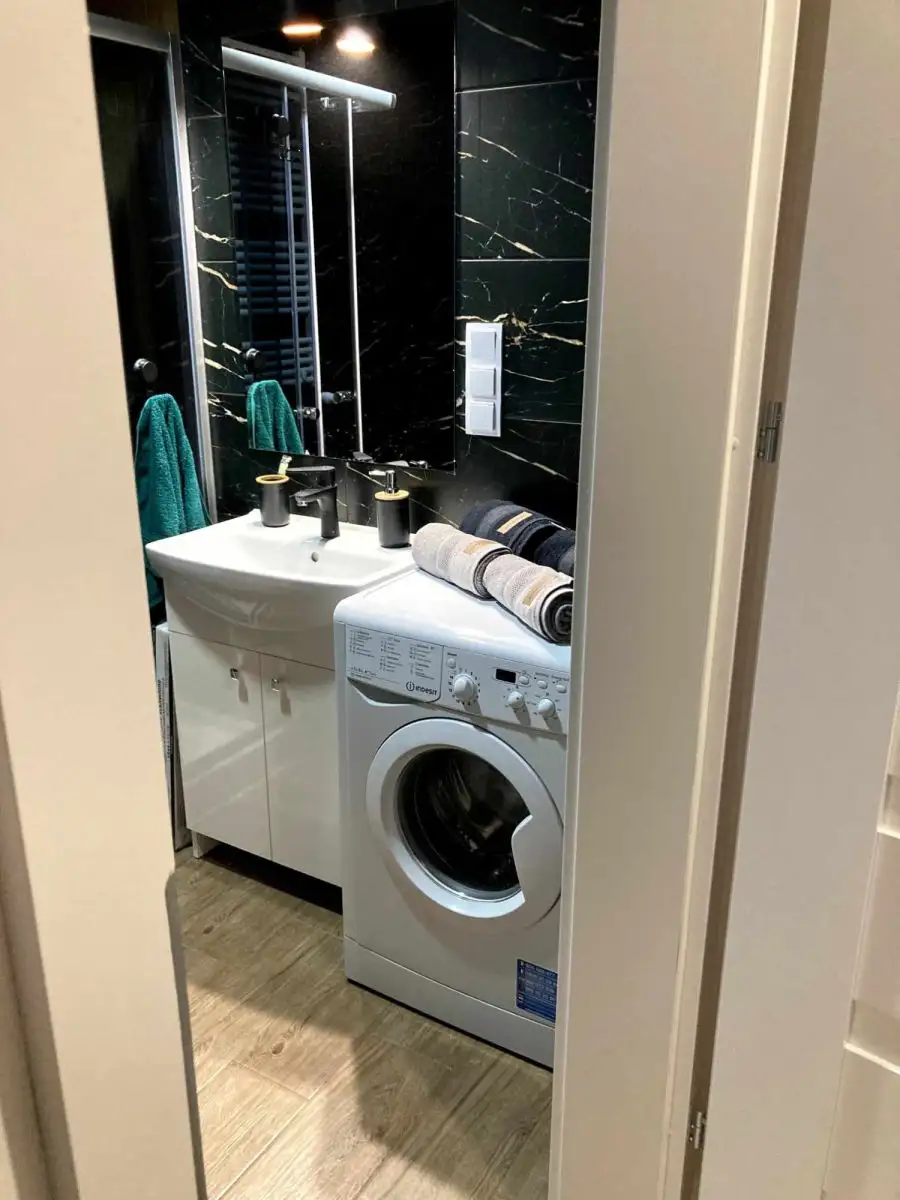 - Duża łazienka z kabiną prysznicową, pralką, umywalką i WC.