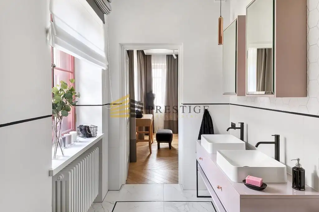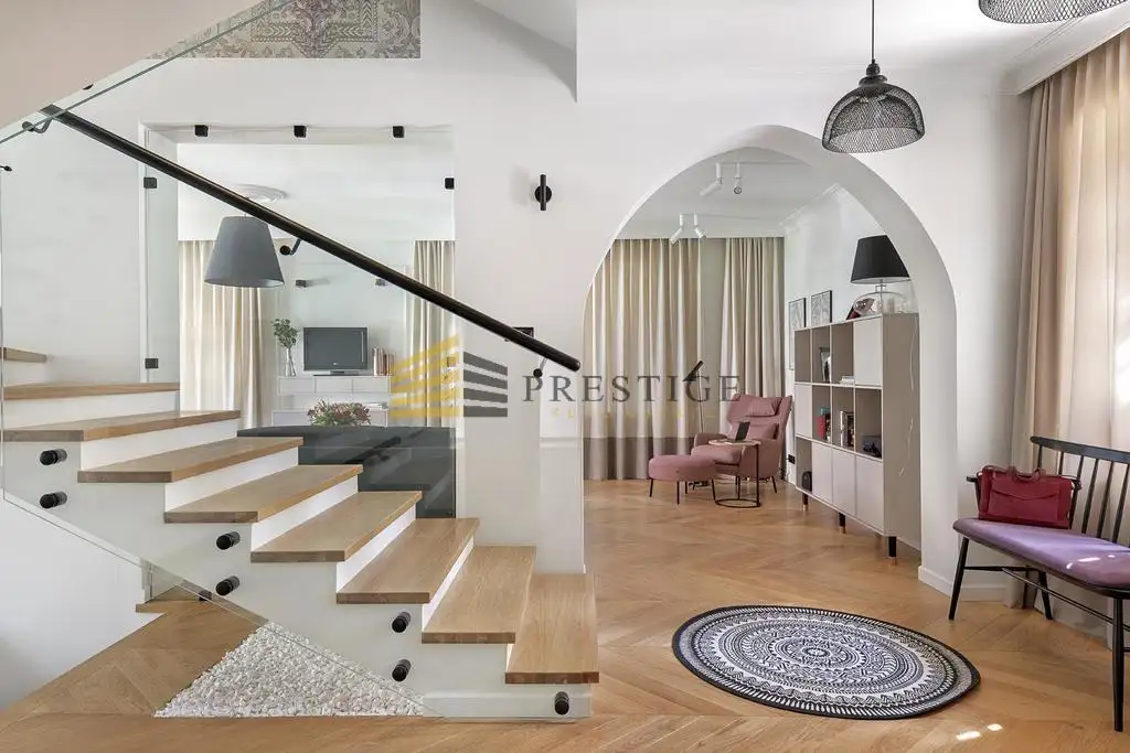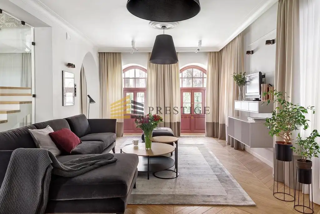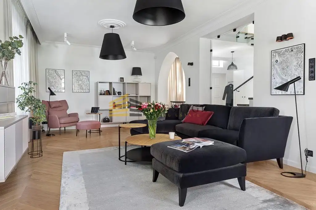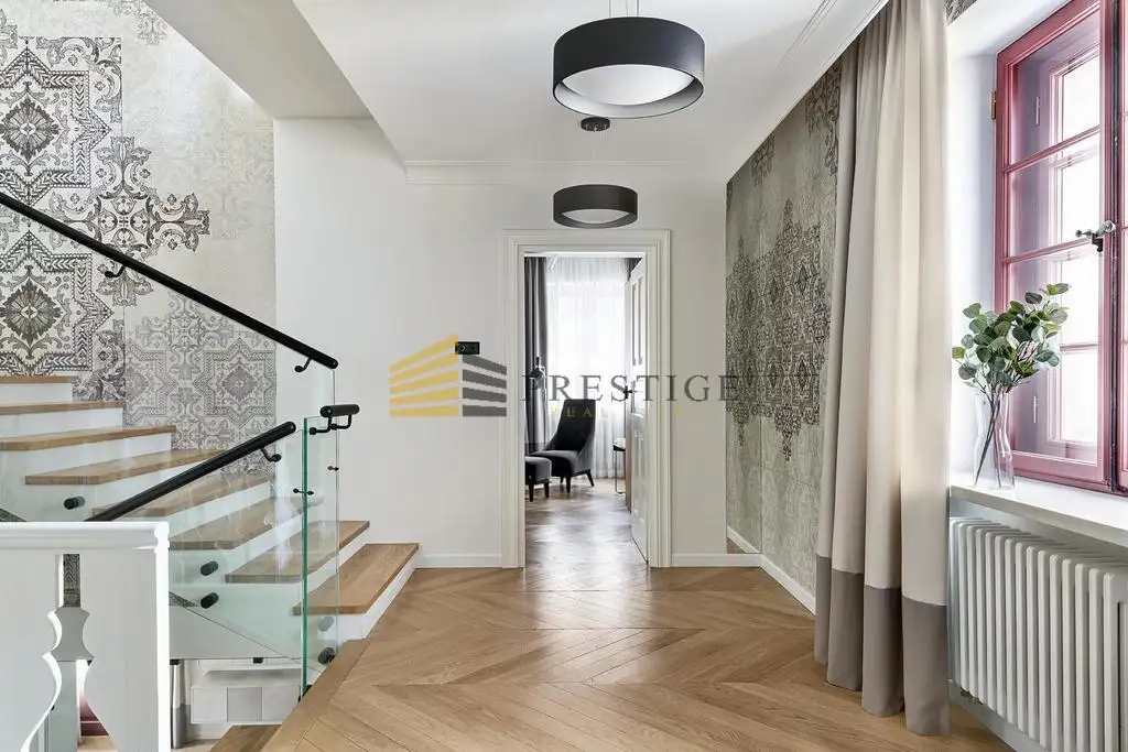 We invite you to rent this exceptional restored villa with unique character, located in the prestigious district of Sadyba. This is a place with an extraordinary atmosphere, which combines rich history with modern living comfort.