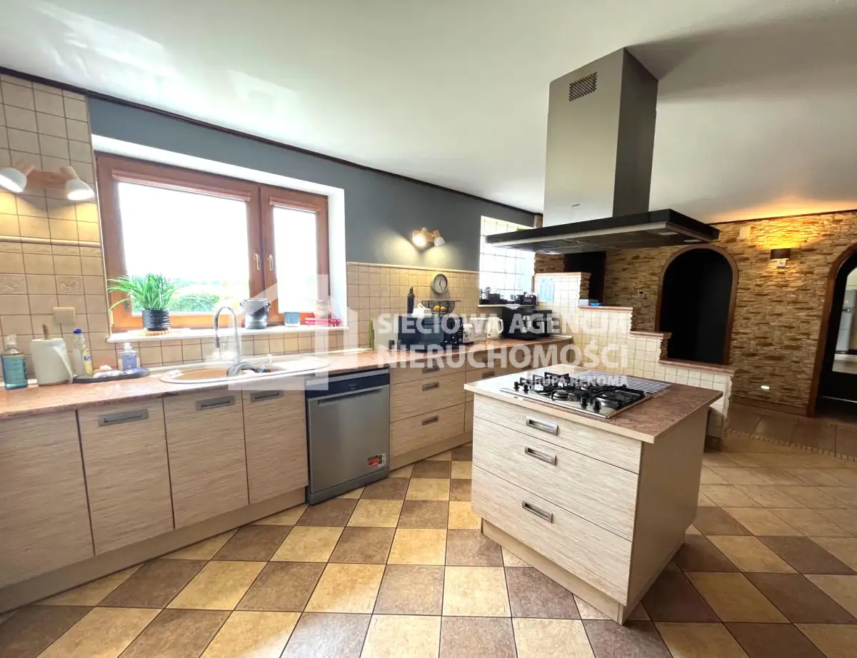Budynek mieszkalny - funkcjonalność i przestrzeń, na parterze przestronna kuchnia z jadalnią, salon z kominkiem i wyjściem do ogrodu, dwa małe pokoje, łazienka, pomieszczenia gospodarcze, pralnia i kotłownia.