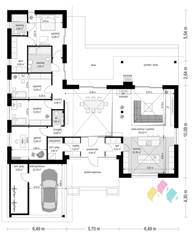 Bardzo funkcjonalny rozkład pomieszczeń zapewnia miejsce na odpoczynek i pracę.