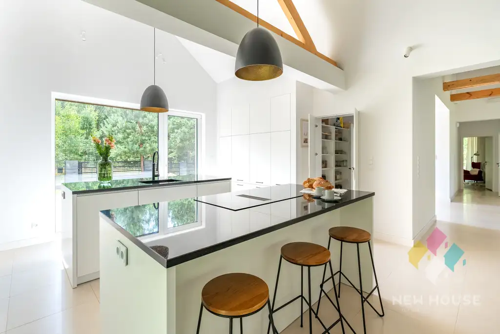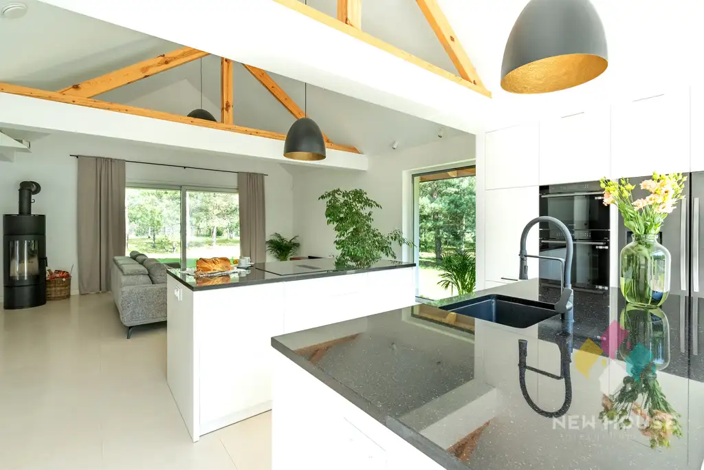 Duże przeszklenia w części dziennej otwierają wnętrze na ogród, zapewniając doskonałe doświetlenie. Nowoczesna kuchnia (wysokiej jakości sprzęt AGD, płyta indukcyjna z wbudowanym wyciągiem, blat granitowy) stanowi idealne miejsce do wspólnego gotowania.