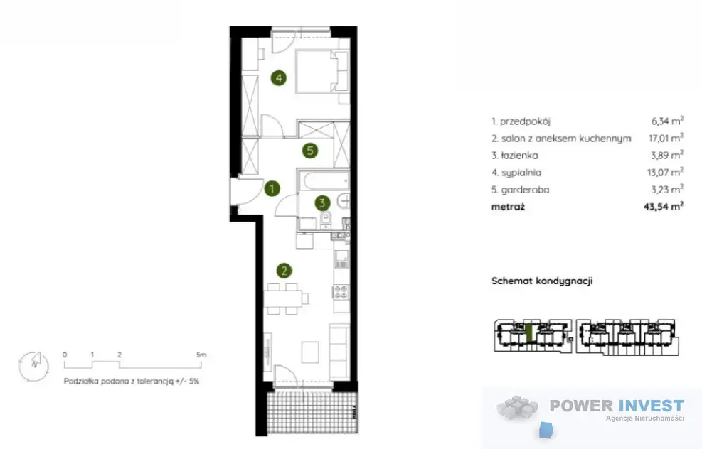 Przedpokój – 6,34 m² Salon z aneksem kuchennym – 17,01 m² Sypialnia – 13,07 m² Łazienka – 3,89 m² Garderoba – 3,23 m²