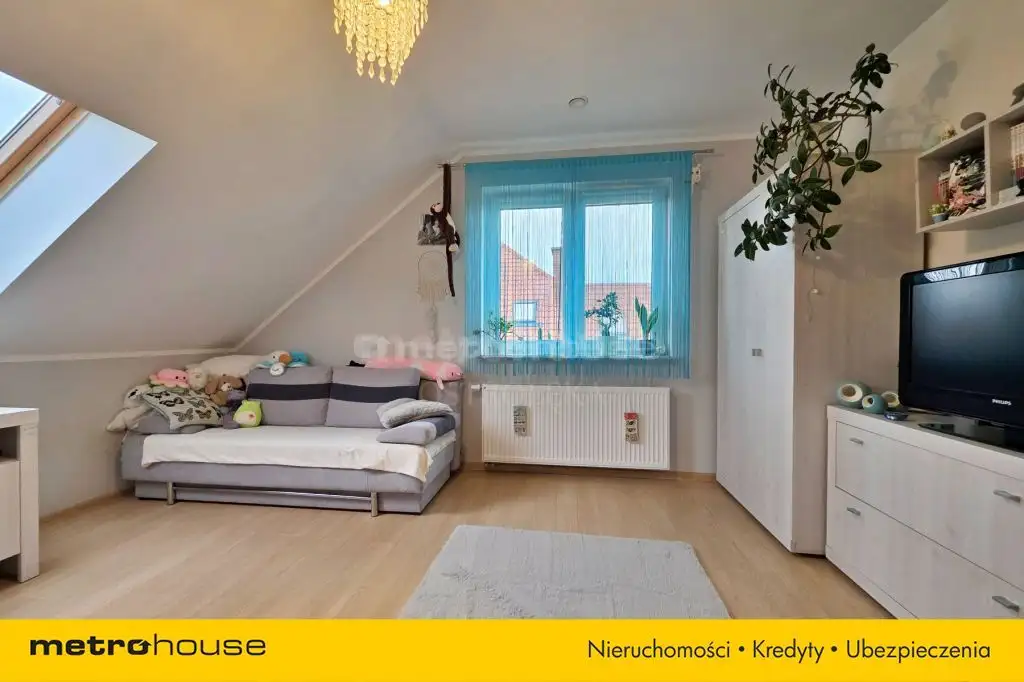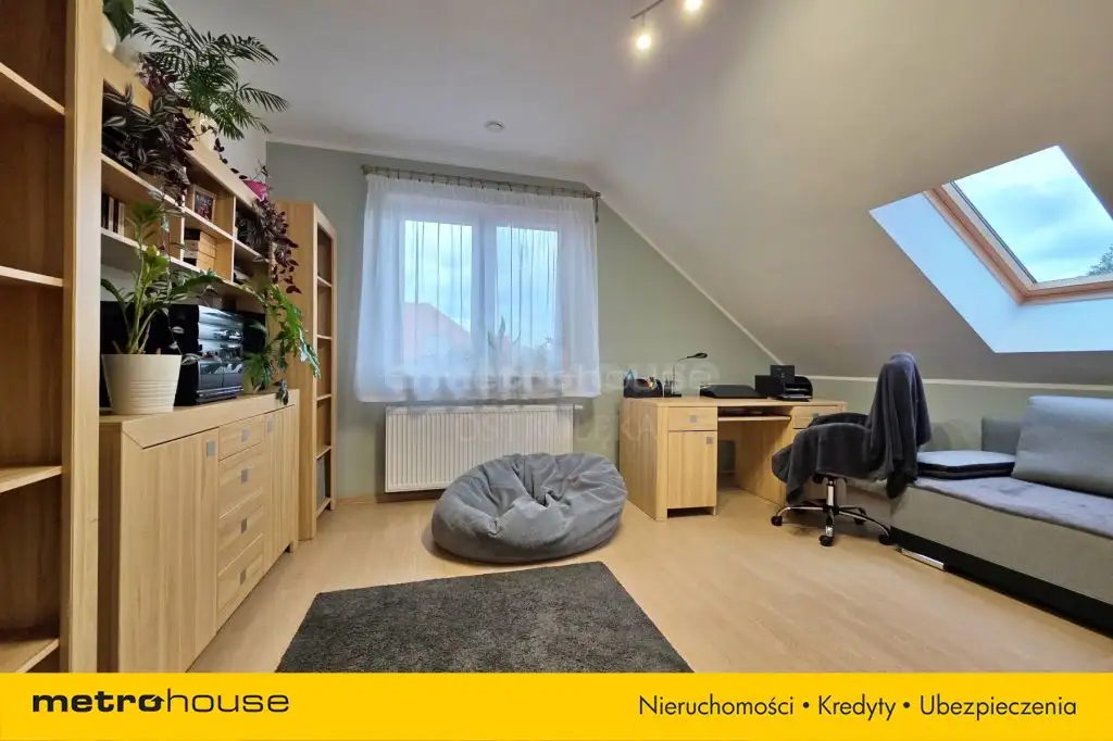 Na parterze domu znajduje się duży, jasny salon z jadalnią, który stanowi serce całego domu i doskonałe miejsce do wspólnego spędzania czasu z rodziną. Z salonu można wyjść bezpośrednio do ogrodu, co latem pozwala cieszyć się przestrzenią i zielenią. Obok mieści się praktyczna kuchnia. Na tym poziomie jest również łazienka z prysznicem oraz dodatkowy pokój, który może pełnić funkcję gabinetu, pokoju gościnnego lub sypialni. Z holu prowadzi przejście do garażu o powierzchni 28,12 m², mieszczącego nie tylko samochód, ale też przestrzeń na przechowywanie sprzętu ogrodowego lub rowerów.