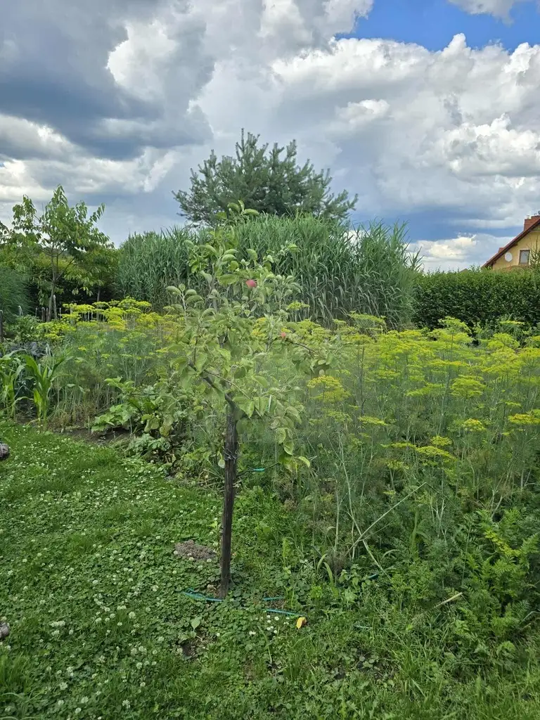 IV. Warzywnik z budynkiem narzędziowych (woda prąd), z ładnym przejściem, w tej części również oczyszczalnia trzcinowa
