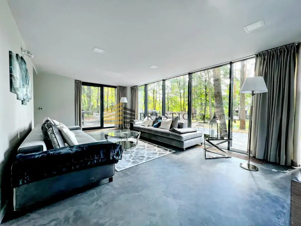- salon z ogromnymi przeszkleniami, ogrodem zimowym oraz wyjściem na taras i ogród,