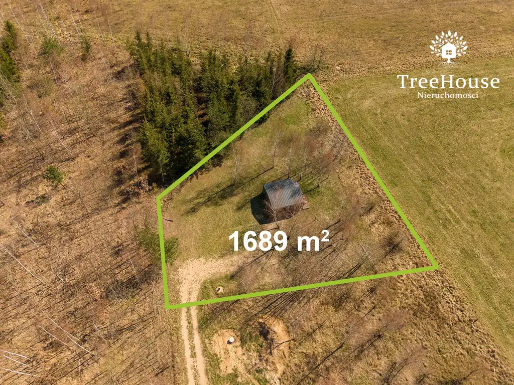 Działka o powierzchni 1689 m² ma kształt trapezu. Jej naturalne granice wyznaczają drzewa – brzozy, topole i wierzby – co sprawia, że nie wymaga ogrodzenia. Przestrzeń wokół domku daje ogromne możliwości aranżacyjne – zarówno dla własnego komfortu, jak i z myślą o dalszej inwestycji.