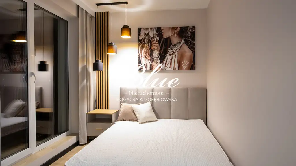 - Sypialnia oddzielona oszkloną ścianą przesuwną, z dużym łóżkiem, któea pomoże Ci się zregenerować lub odprężyć po ciężkim dniu pracy,