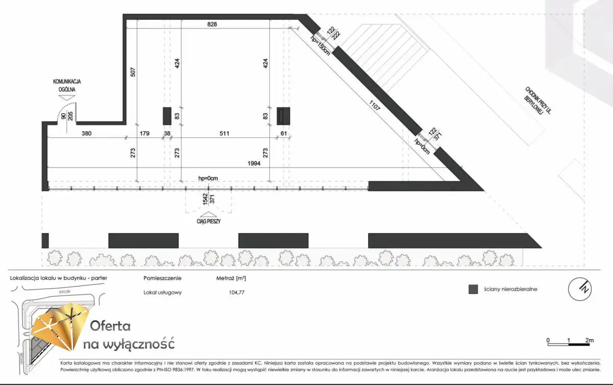 Lokal typu open space o powierzchni 105 m² (dokładnie 104,77 m² według rzutu) oferuje elastyczną przestrzeń.