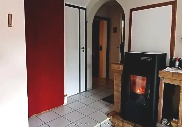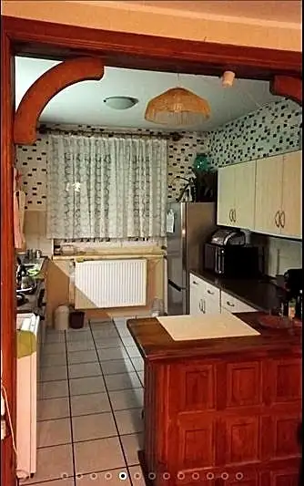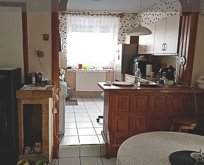 Standard wnętrza do odświeżenia : w przedpokojach i pokojach na posadzkach kafle oraz parkiety, na ścianach tynki oraz gładzie, stolarka okienna PCV z roletami zewnętrznymi . Dwie kuchnie i trzy łazienki wykafelkowane . Dach kryty blachą, ściany zewnętrzne warstwowe + tynk w kolorze pastelowym. Dom ogrzewany z nowego pieca gazowego oraz alternatywnie każde mieszkanie wyposażone jest w kominek na pelet.