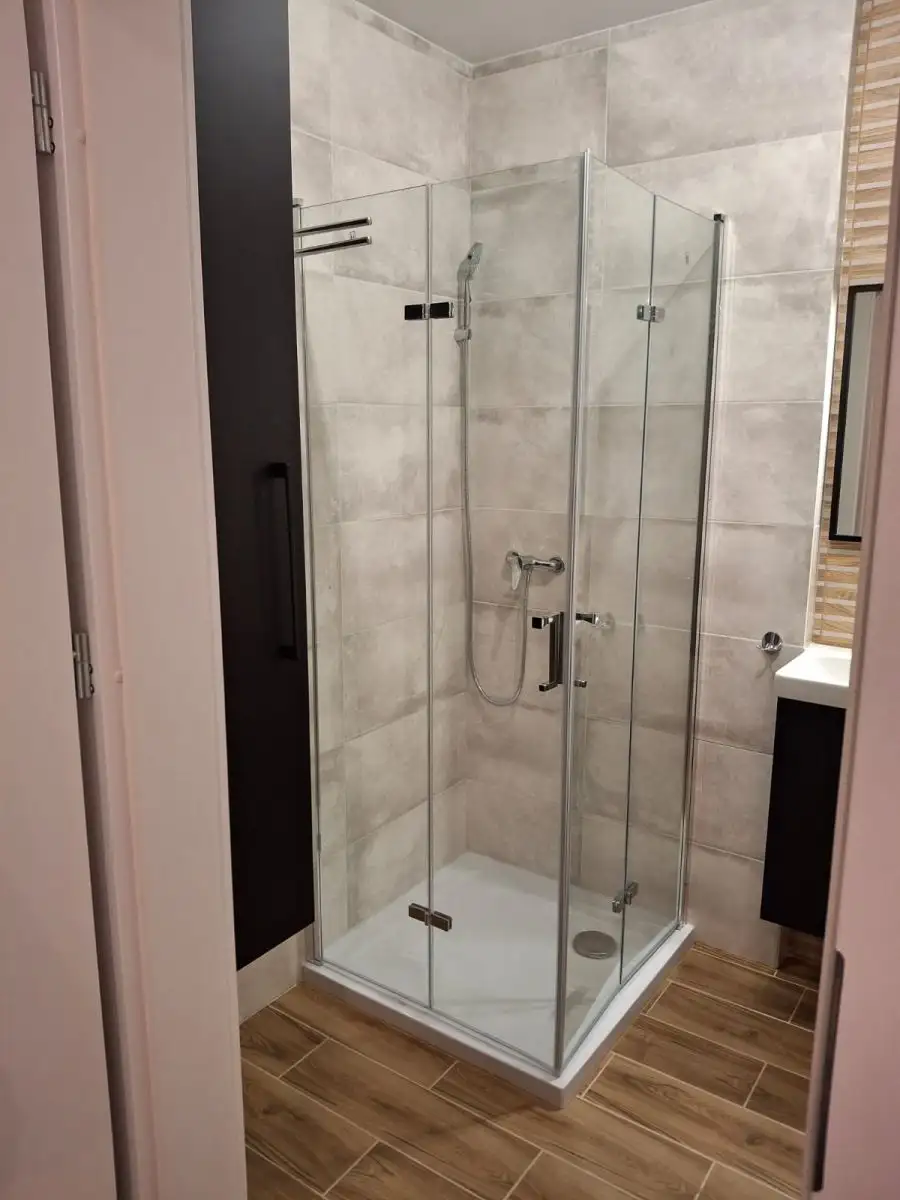 • łazienka z kabiną prysznicową składaną, WC, pralką i meblami łazienkowymi,