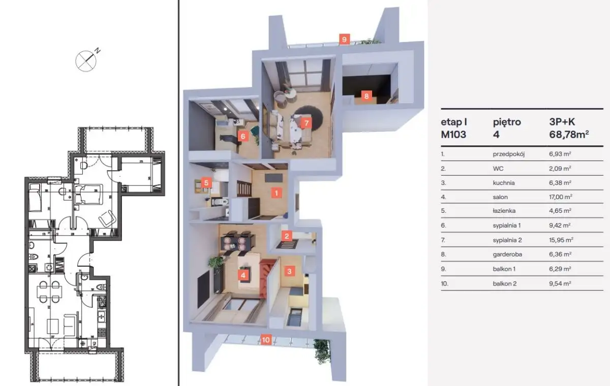 Trzypokojowe mieszkanie o powierzchni projektowej 72,87 m² z wystawą okien na północny-wschód i południowy-zachód