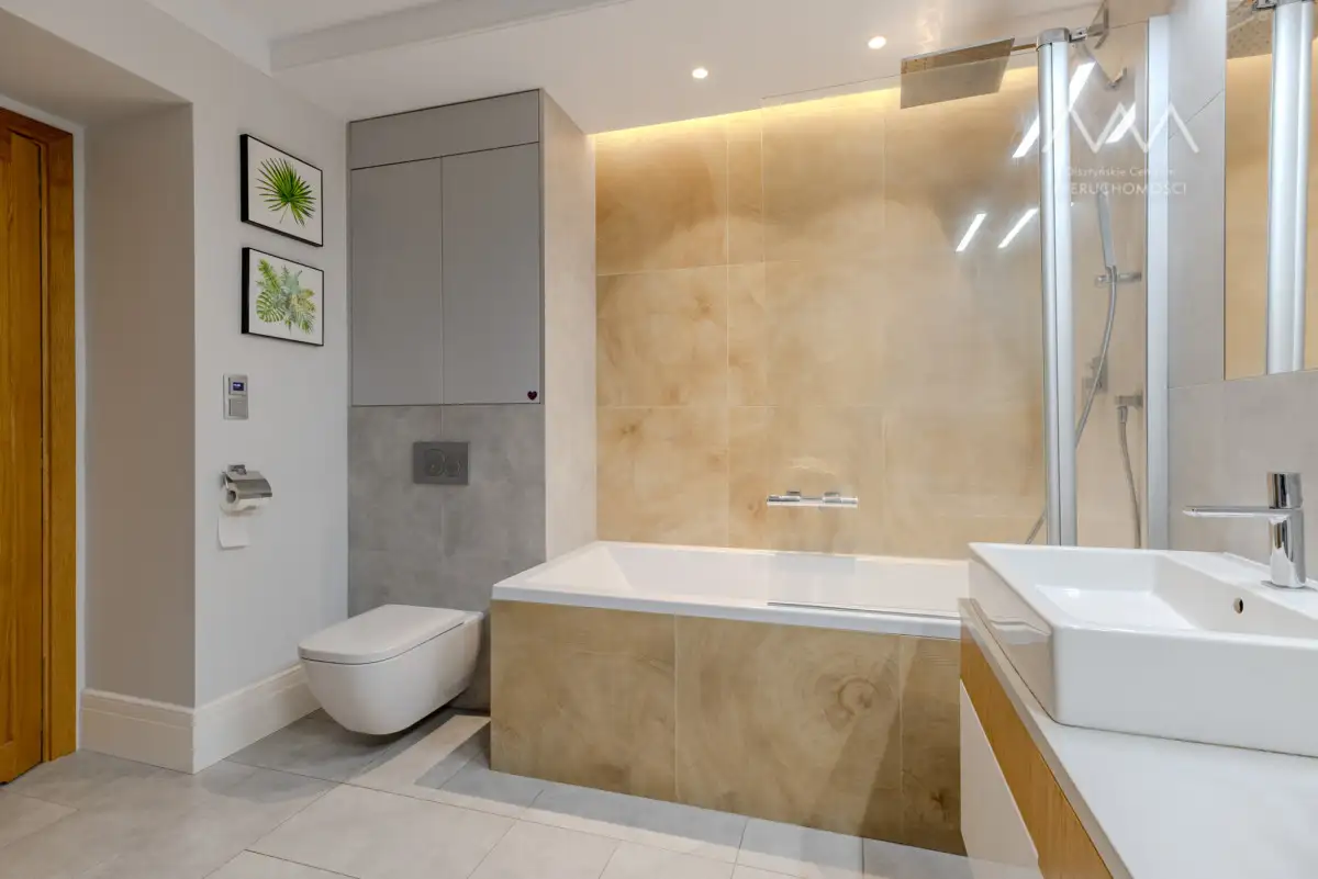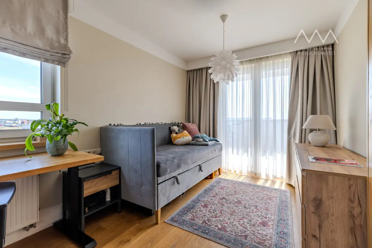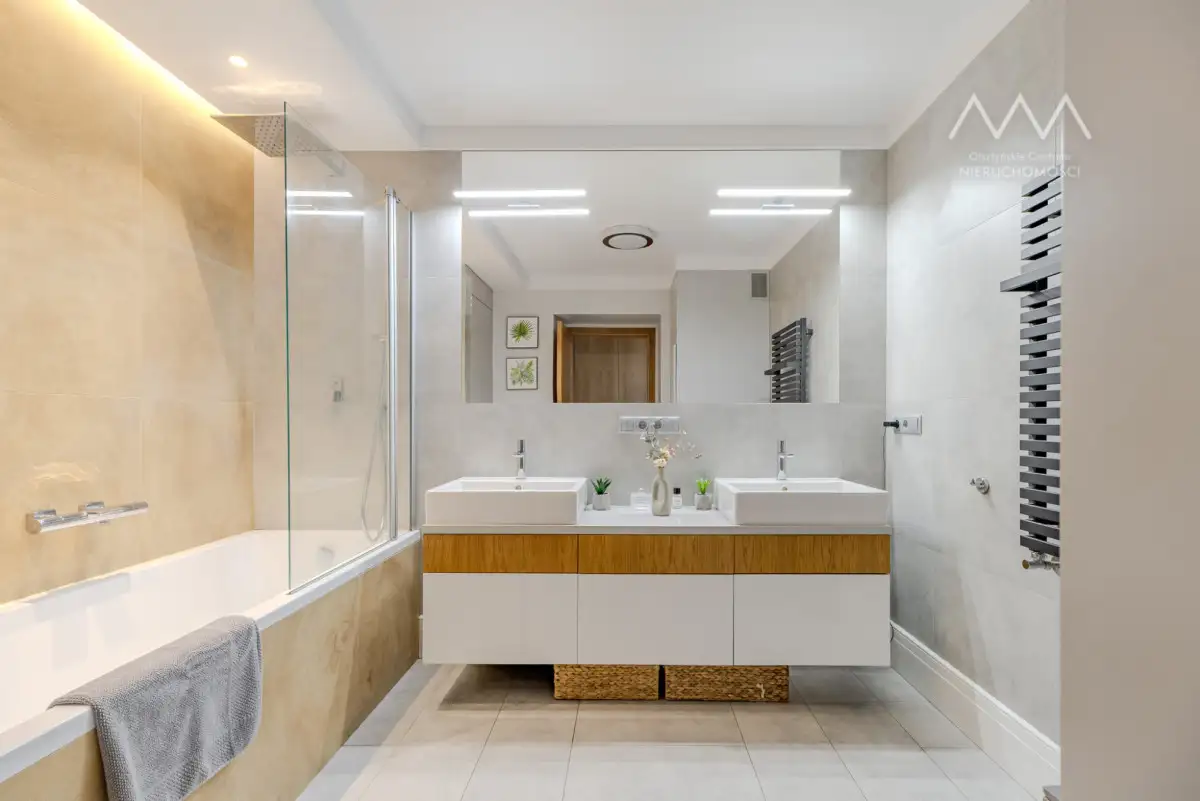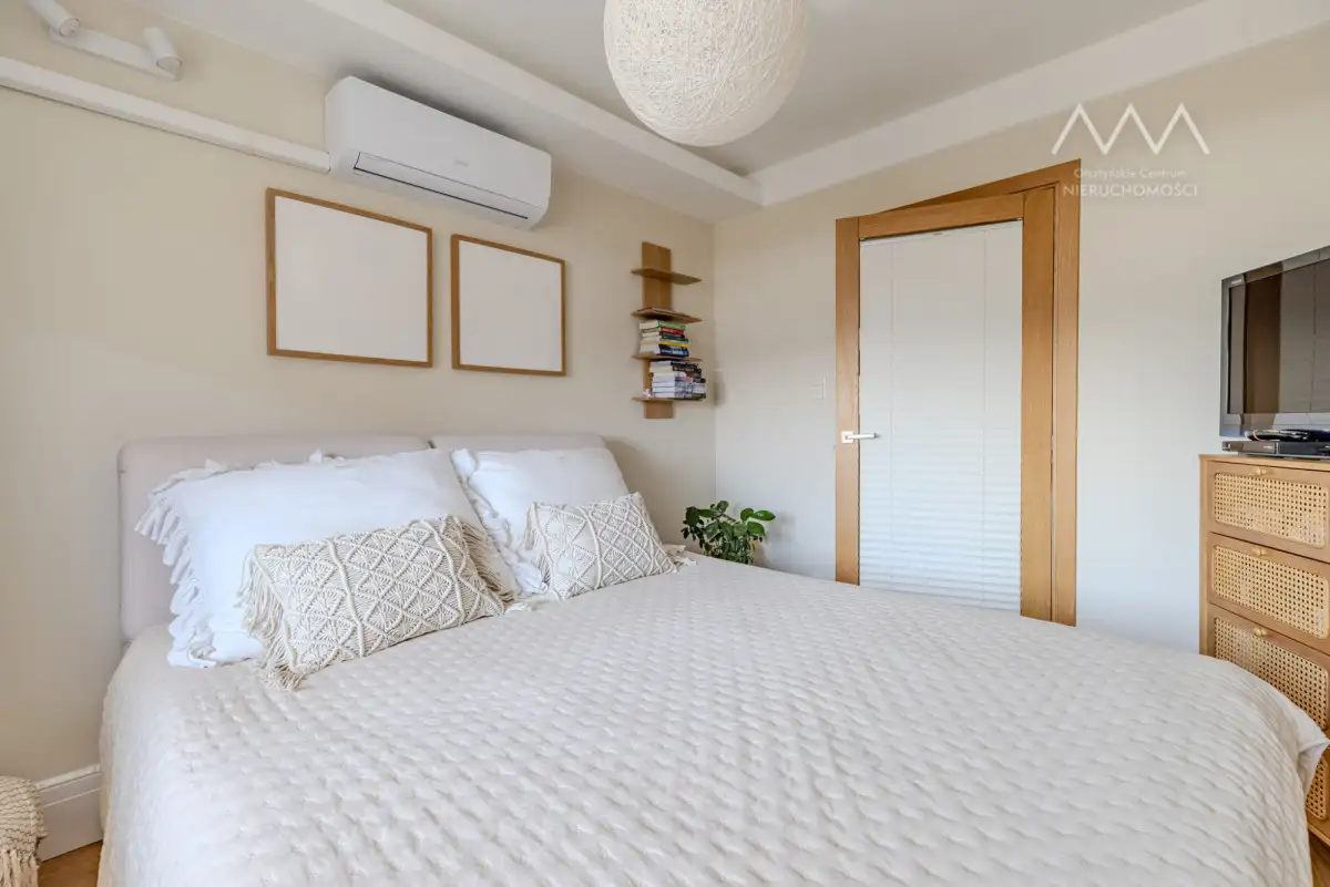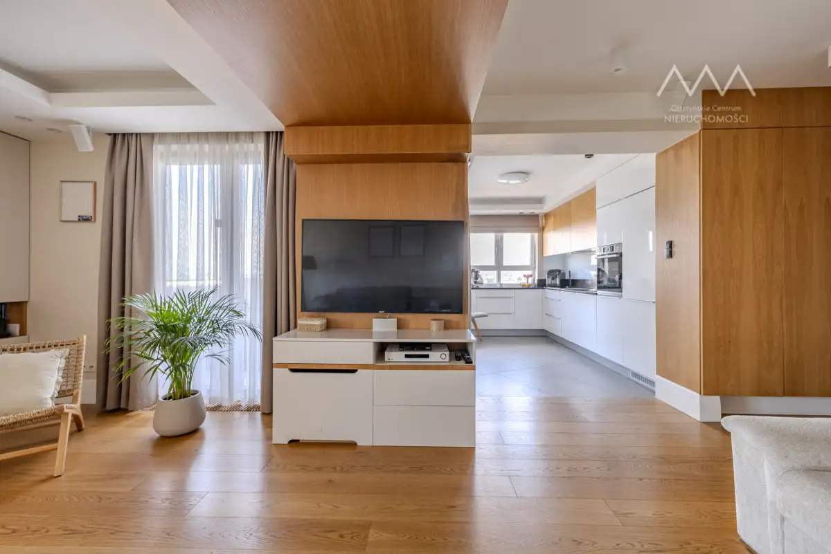 Wnętrza zostały zaprojektowane i wykończone z użyciem materiałów najwyższej jakości. Mieszkanie oferowane jest wraz z unikatowymi meblami wysokiej klasy, które zostały wykonane na zamówienie lub sprowadzone z renomowanych europejskich salonów. Na podłogach znajduje się drewniana deska renomowanej firmy KACZKAN, która nadaje wnętrzu elegancji i ciepła. W przedpokoju jak również w każdej sypialni znajdują się praktyczne szafy w zabudowie, zapewniające dużo miejsca do przechowywania. Dodatkowym atutem jest fakt ,że w mieszkaniu pozostaje nowoczesne i gustowne oświetlenie ,co stanowi wygodę dla przyszłych właścicieli.