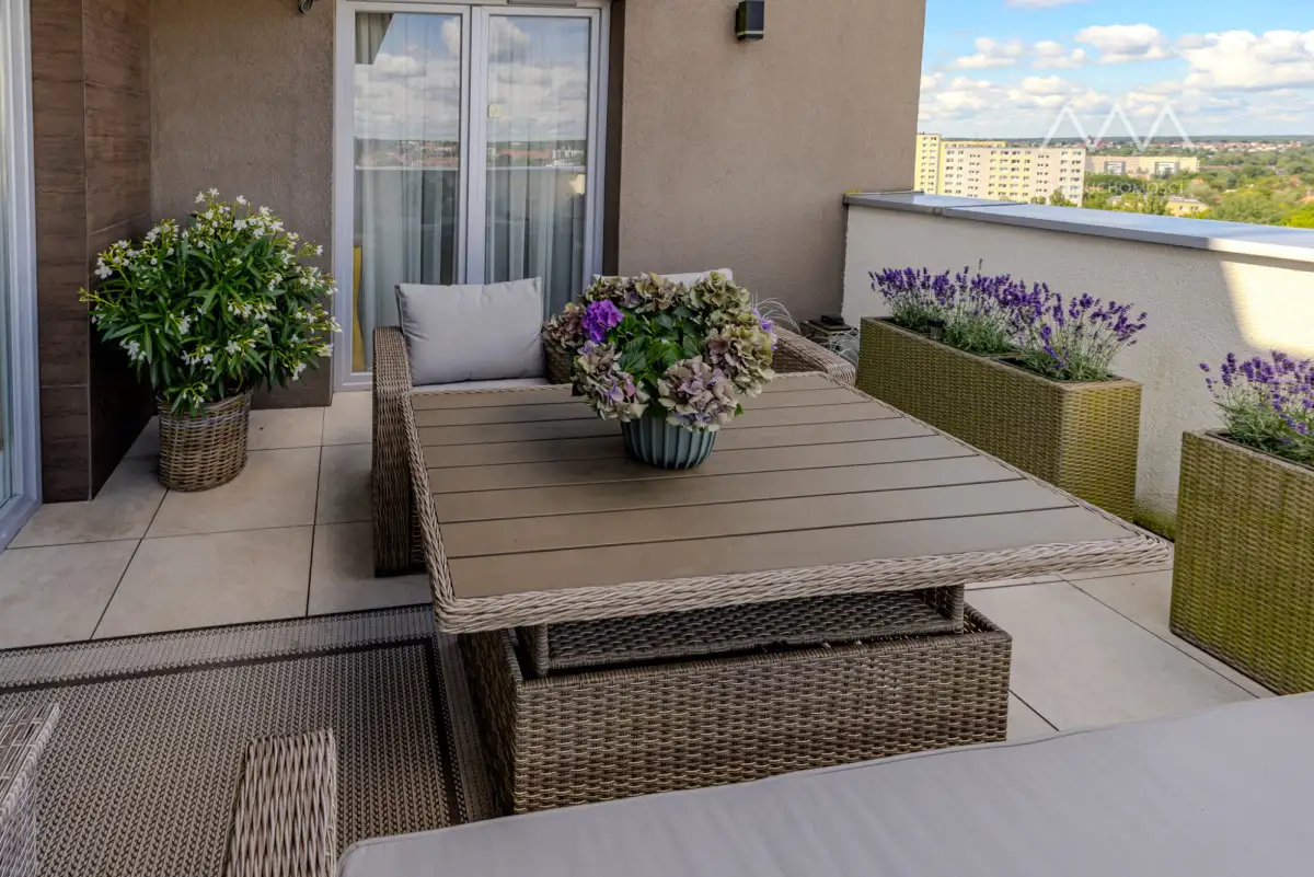 - Tarasy :2 duże tarasy ,w tym jeden z zamontowanymi lampami grzewczymi idealny do wypoczynku przez cały rok