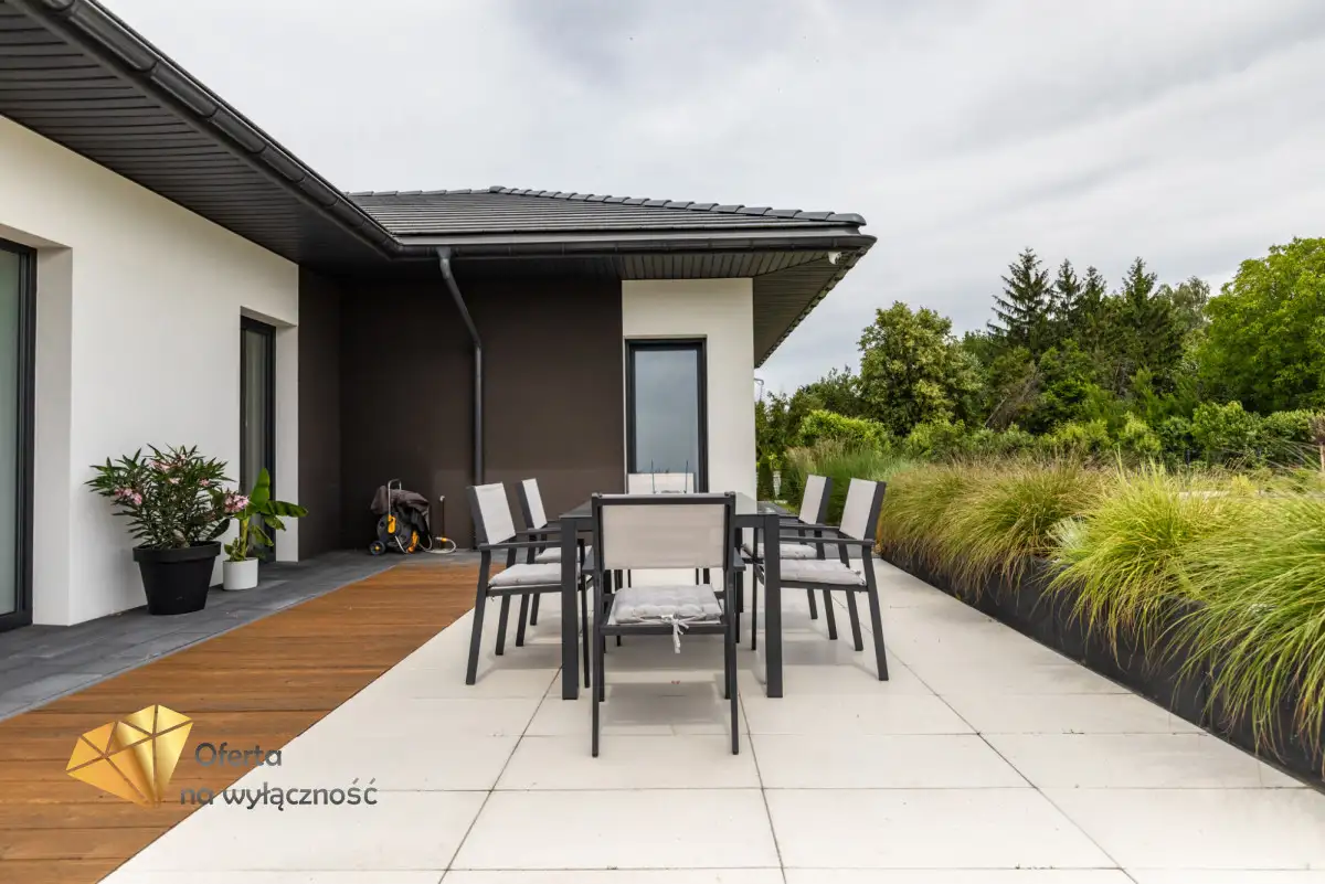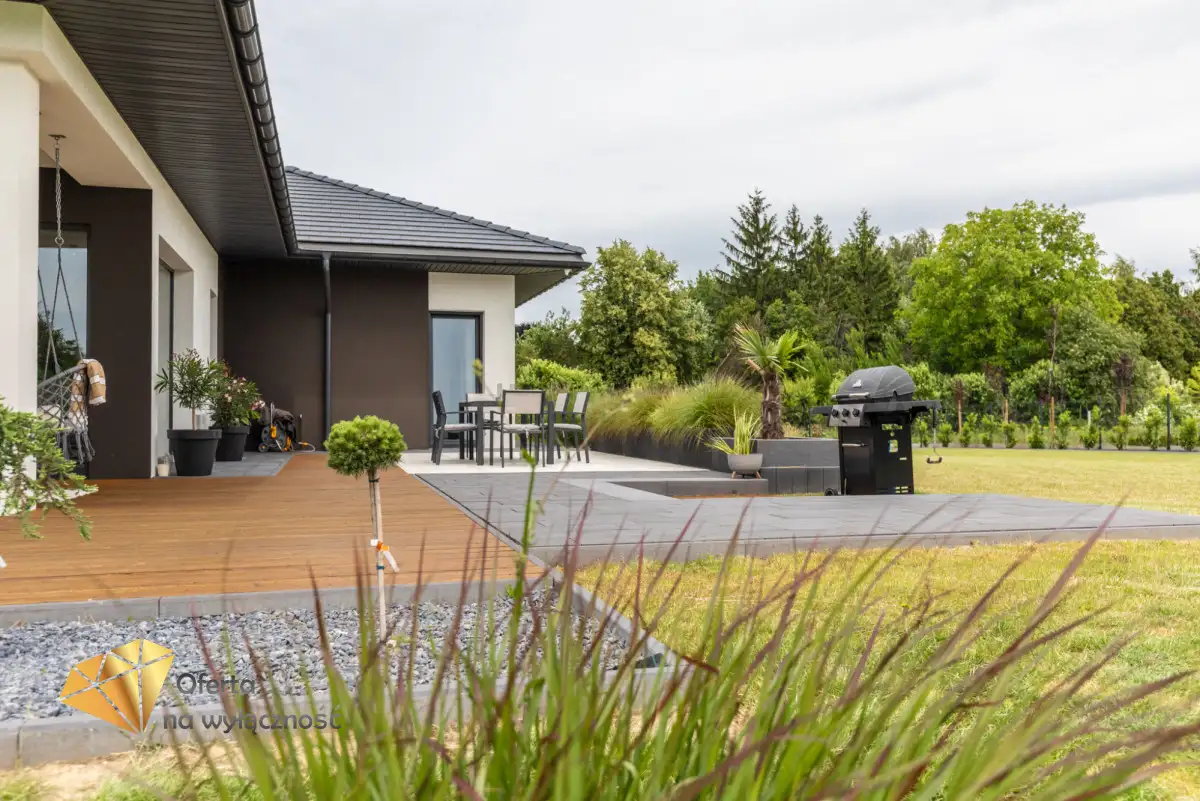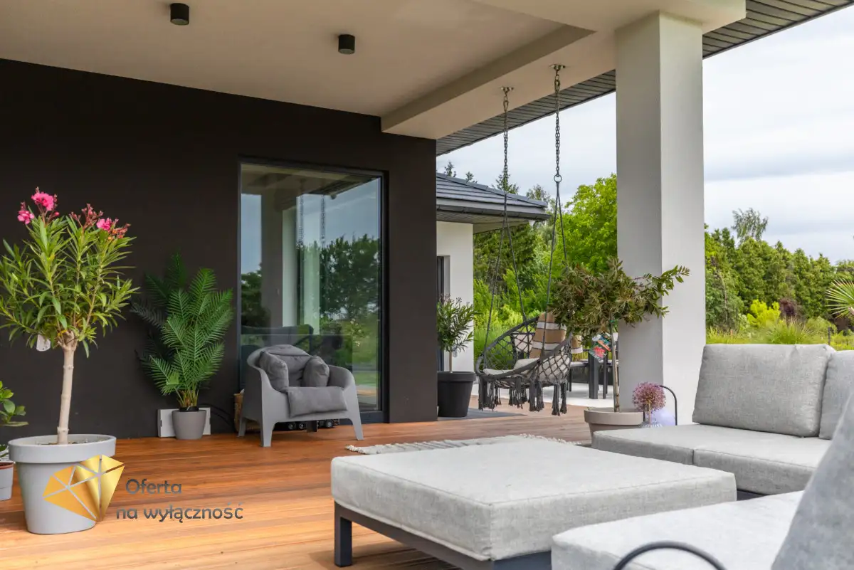- Wyjście na piękny, duży taras ze strefą relaksu, miejscem na rodzinne obiady, grillem i huśtawką