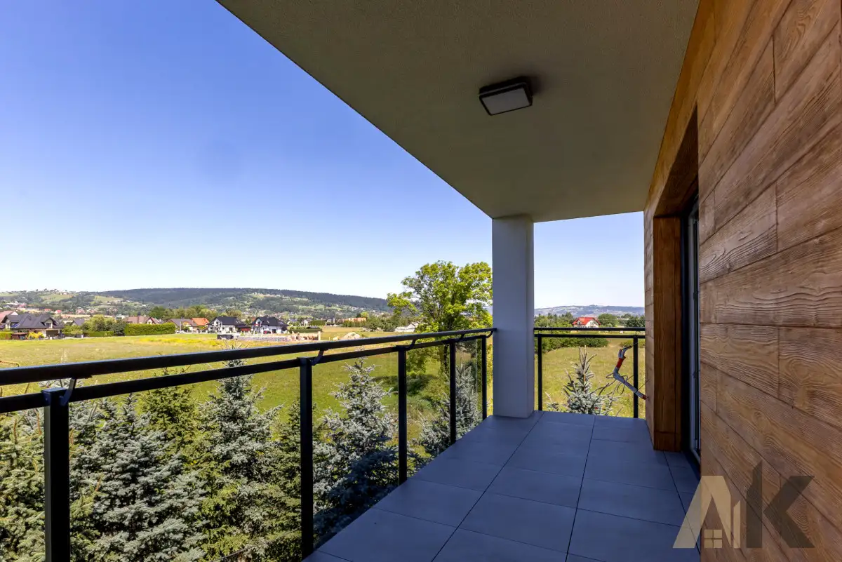 Podobnie jak w mniejszym lokalu, tu również znajdziesz duży balkon z widokiem na Beskid Sądecki , a przemyślany układ pomieszczeń umożliwia dowolną aranżację przestrzeni.