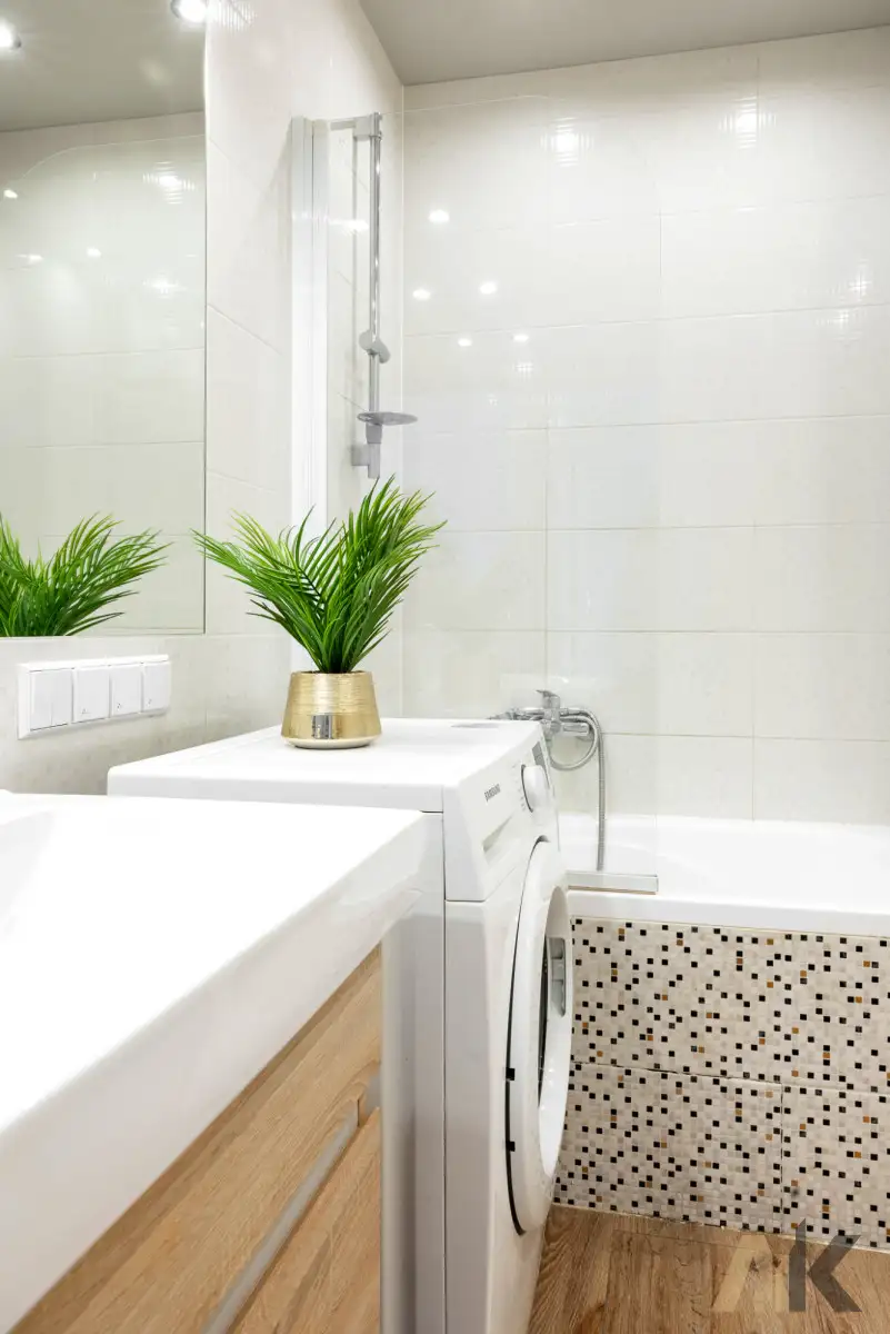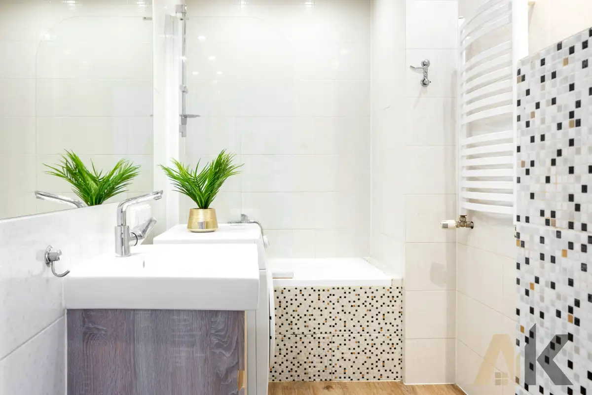 Łazienka: Szafka łazienkowa z umywalką, wanna, pralka.