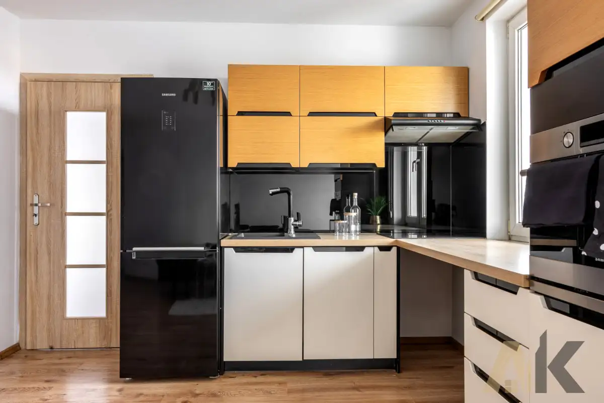 Kuchnia: otwarta, wyposażona, umożliwiająca swobodne przygotowywanie posiłków. W zabudowie kuchennej: zlewozmywak, zmywarka, lodówka, piekarnik z funkcją mikrofalówki, płyta indukcyjna, okap w zabudowie meblowej.