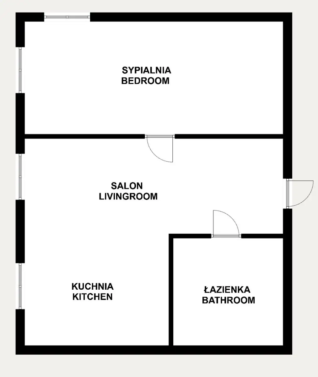 Pokoje: Sypialnia, salon, otwarta kuchnia, łazienka