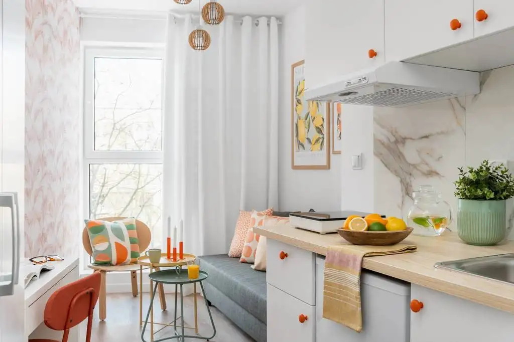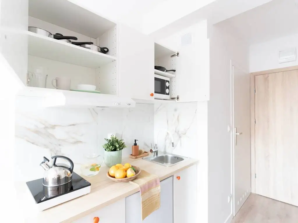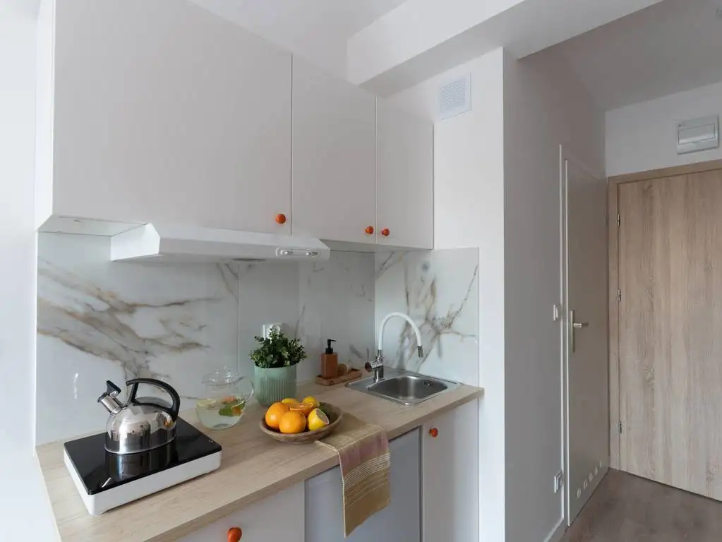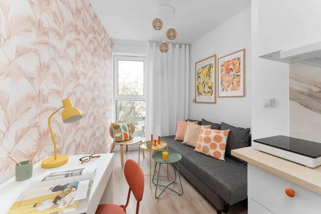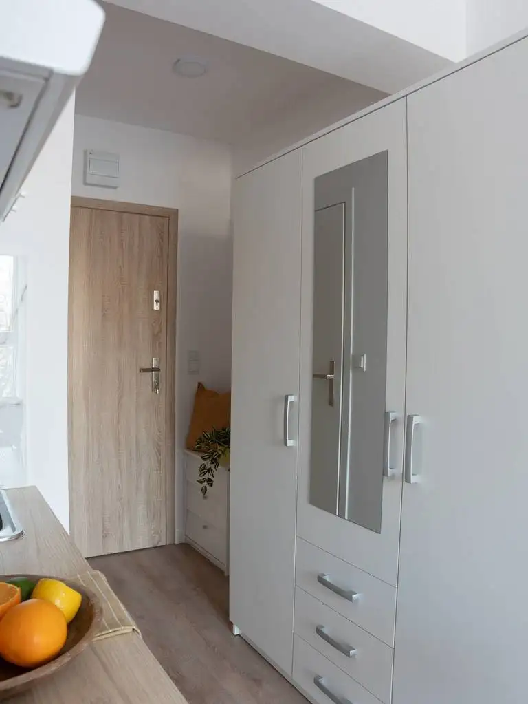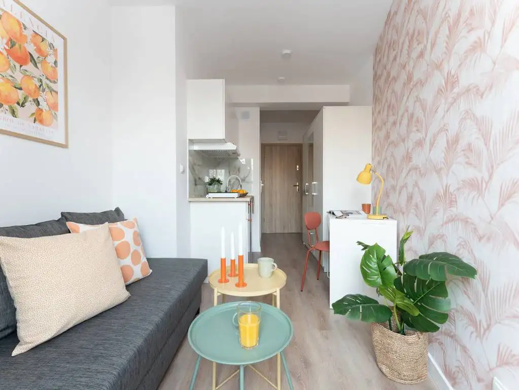 Studio jest nowe, w pełni umeblowane, posiada aneks kuchenny łączony z pokojem dziennym i prywatną łazienkę.